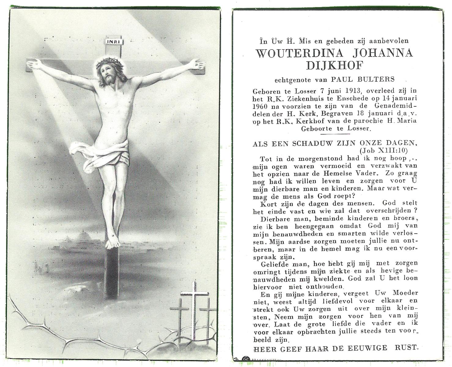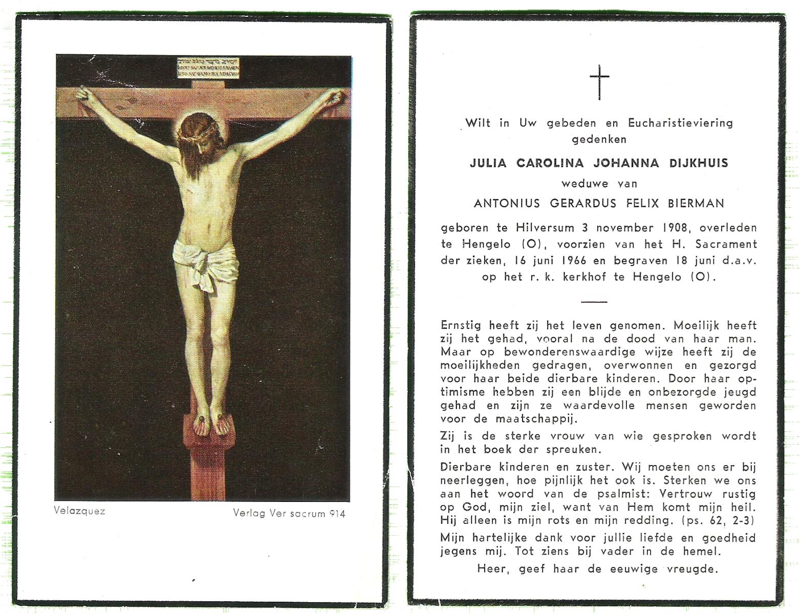 DIJKHUIS, Julia Carolina Johanna, geboren op 3-11-1908 te Hilversum, overleden op 16-6-1966 te Hengelo (Ov.) op 57-jarige leeftijd, begraven op 18-6-1966 te Hengelo (Ov.).