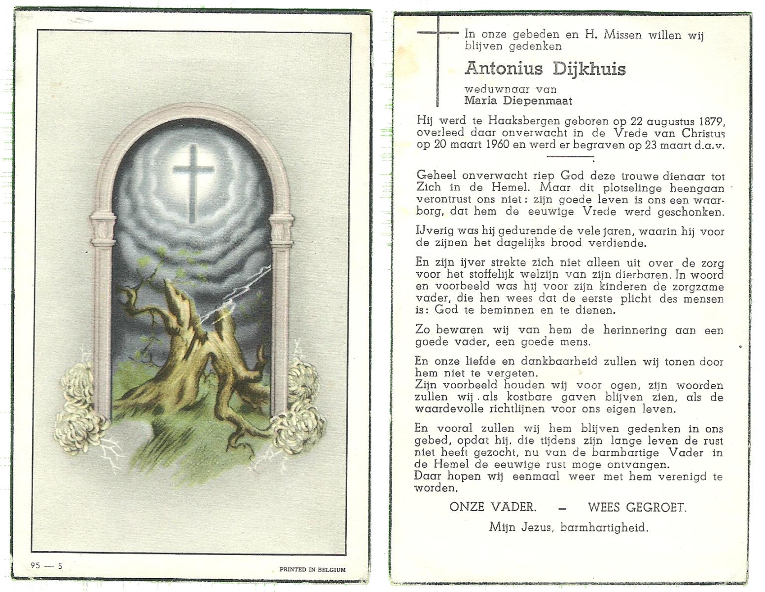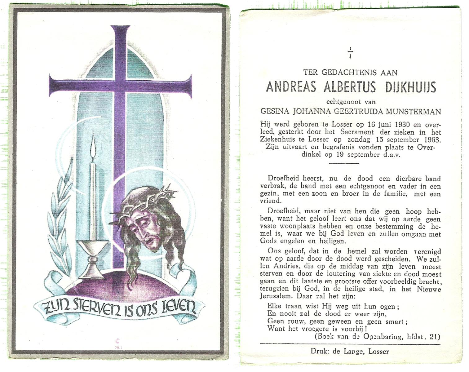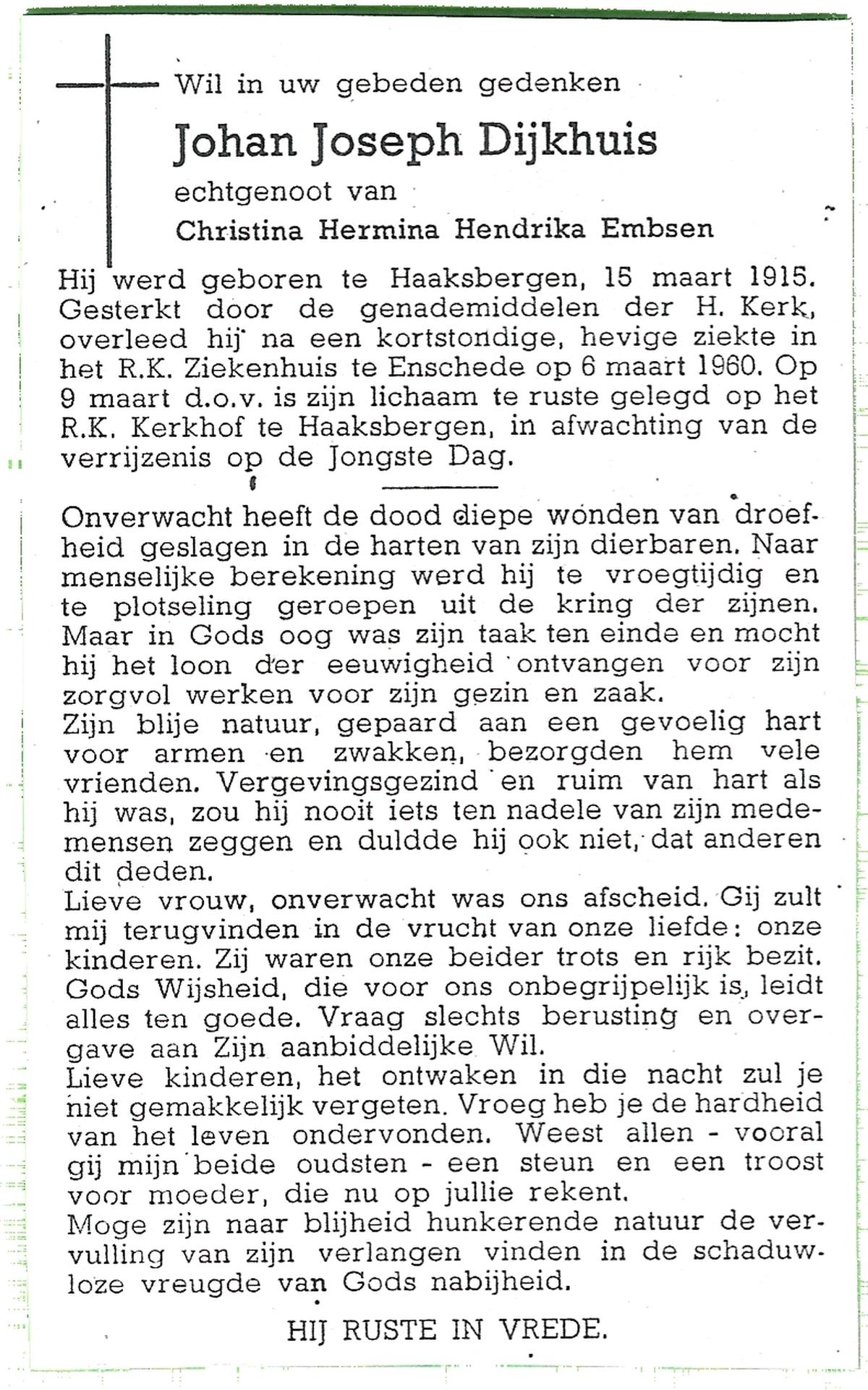 DIJKHUIS, Johan Joseph, geboren op 15-3-1915 te Haaksbergen, overleden op 6-3-1960 te Enschede op 44-jarige leeftijd, begraven op 9-3-1960 te Haaksbergen.