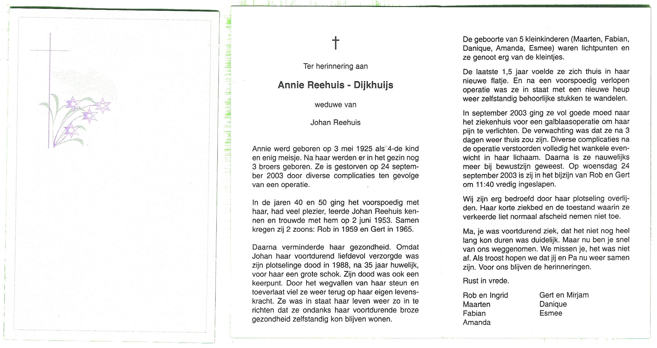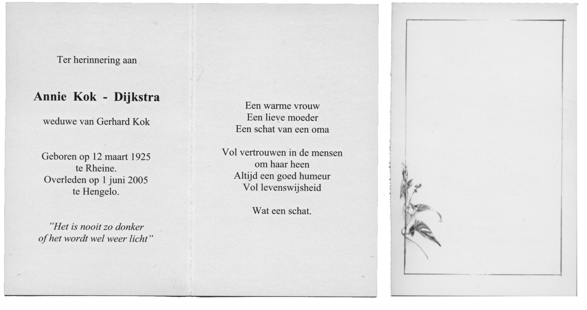 DIJKSTRA, Annie, geboren op 12-3-1925 te Rheine (Dld.), overleden op 1-6-2005 te Hengelo (Ov.) op 80-jarige leeftijd.