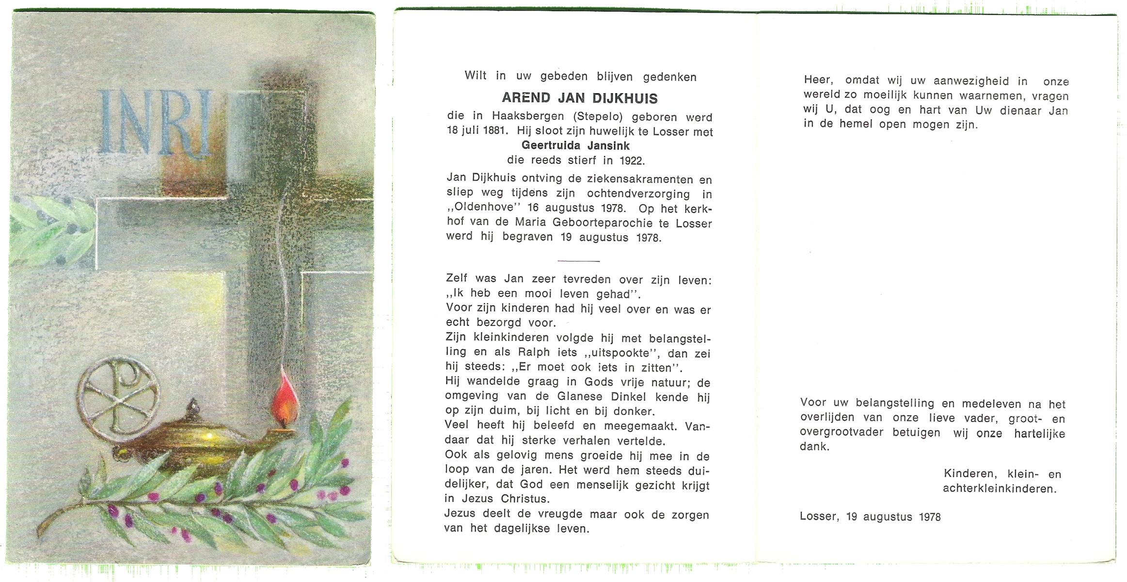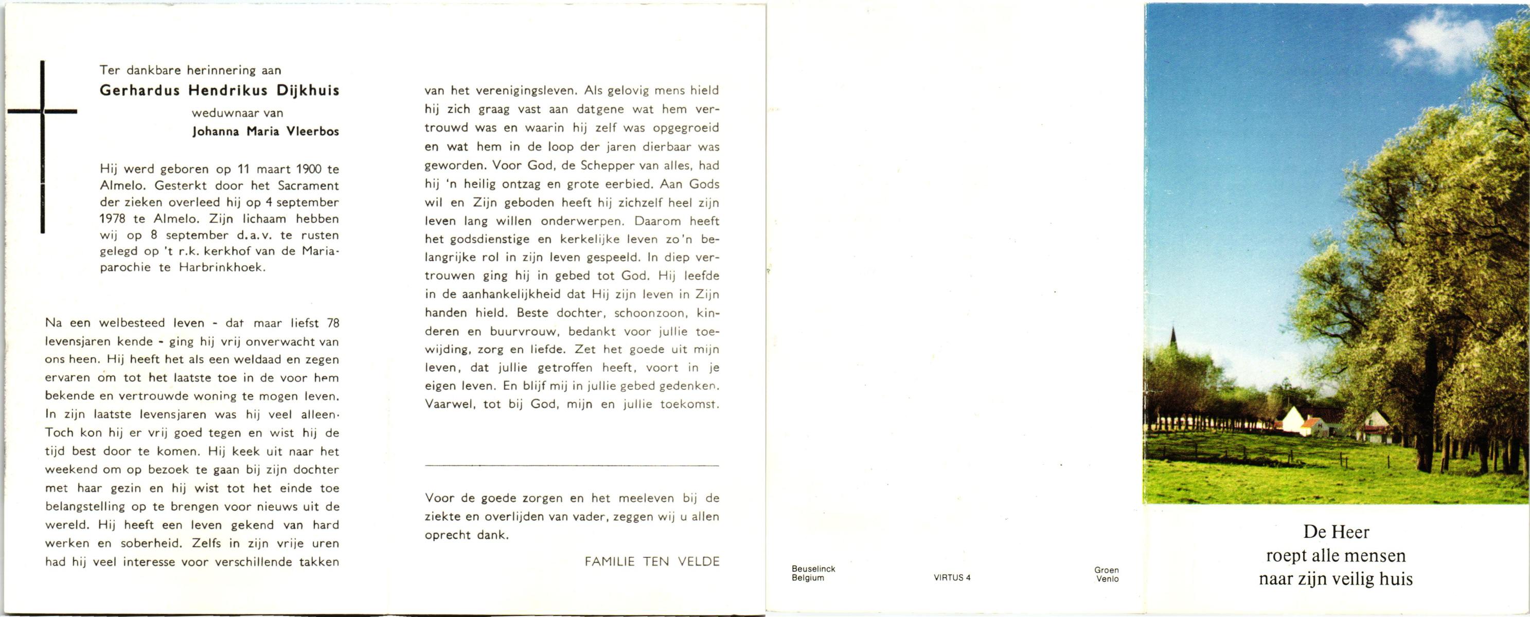 DIJKHUIS, Gerhardus Hendrikus, geboren op 11-3-1900 te Almelo, overleden op 4-9-1978 te Almelo op 78-jarige leeftijd, begraven op 8-9-1978 te Harbrinkhoek.