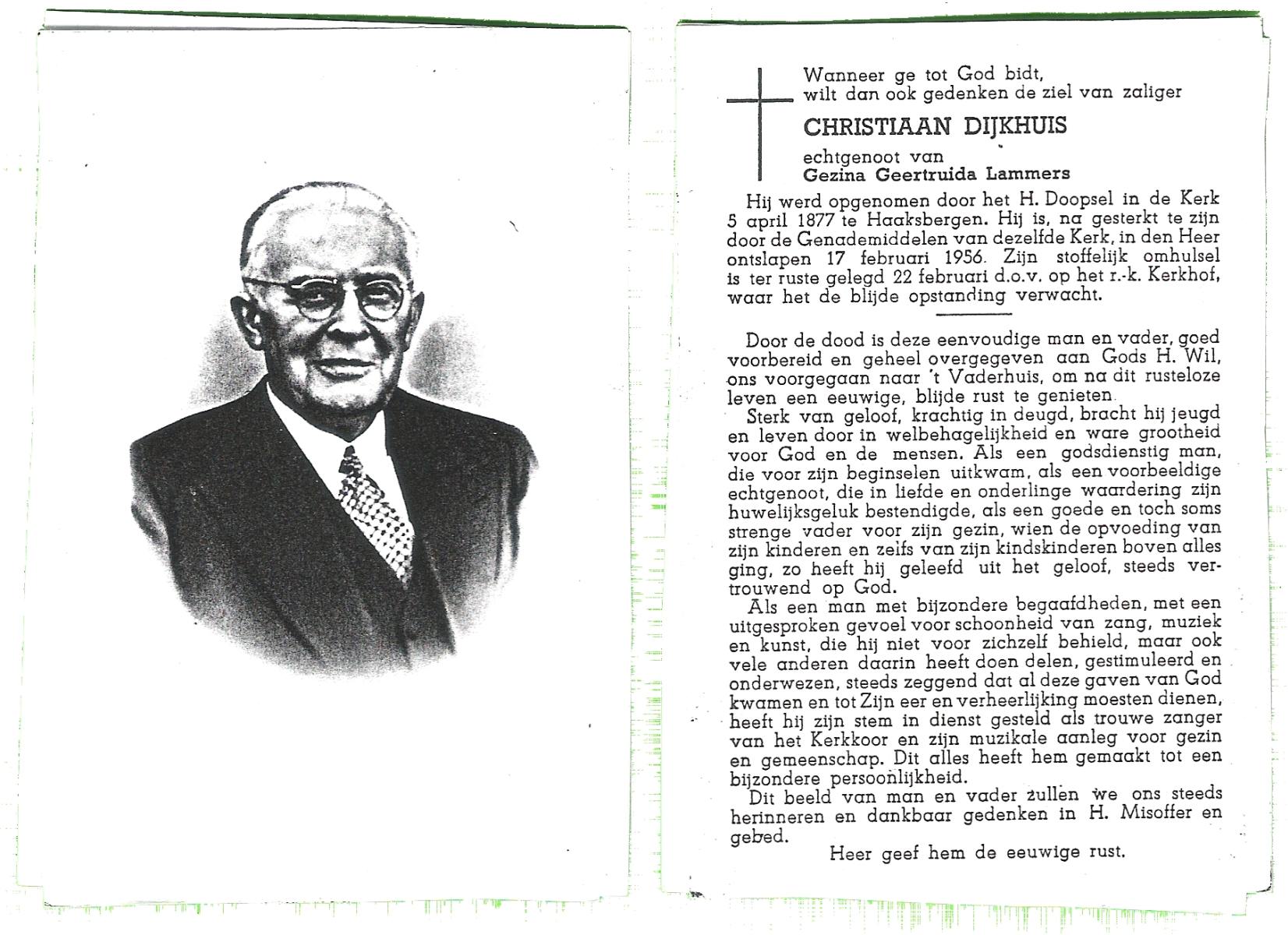 DIJKHUIS, Christiaan, geboren op 05-04-1877 te Haaksbergen, overleden op 17-2-1956 op 78-jarige leeftijd, begraven op 22-2-1956.