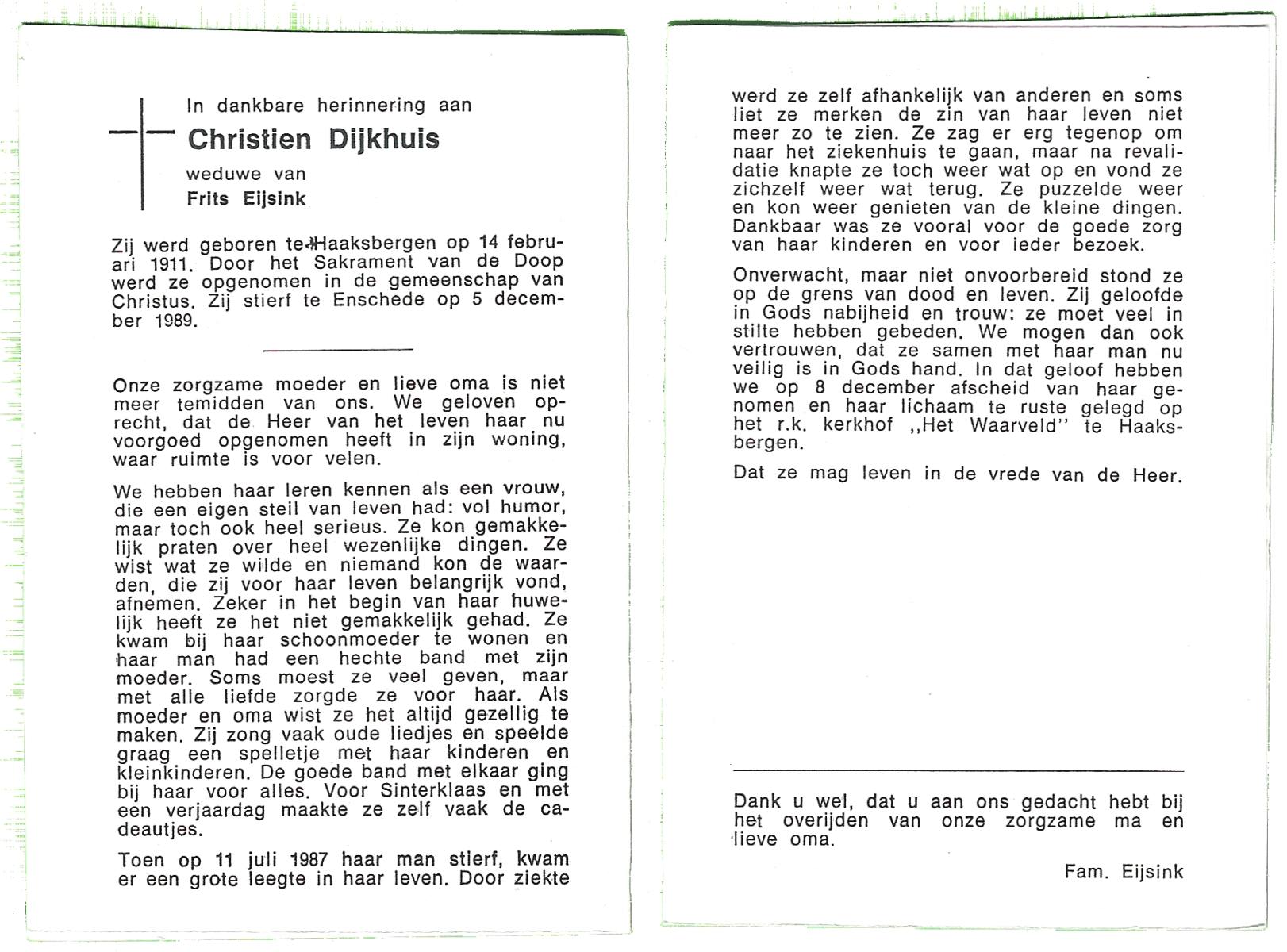 DIJKHUIS, Christien, geboren op 14-2-1911 te Haaksbergen, overleden op 5-12-1989 te Enschede op 78-jarige leeftijd, begraven op 8-12-1989 te Haaksbergen.