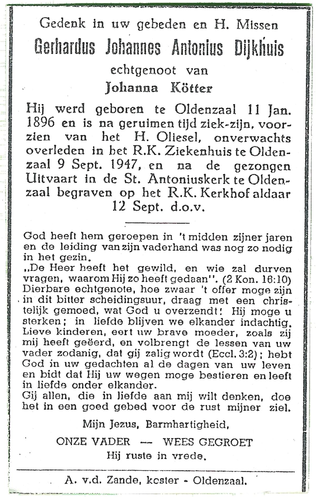 DIJKHUIS, Gerhardus Johannes Antonius, geboren op 11-01-1896 te Oldenzaal, overleden op 9-9-1947 te Oldenzaal op 51-jarige leeftijd, begraven op 12-9-1947 te Oldenzaal.