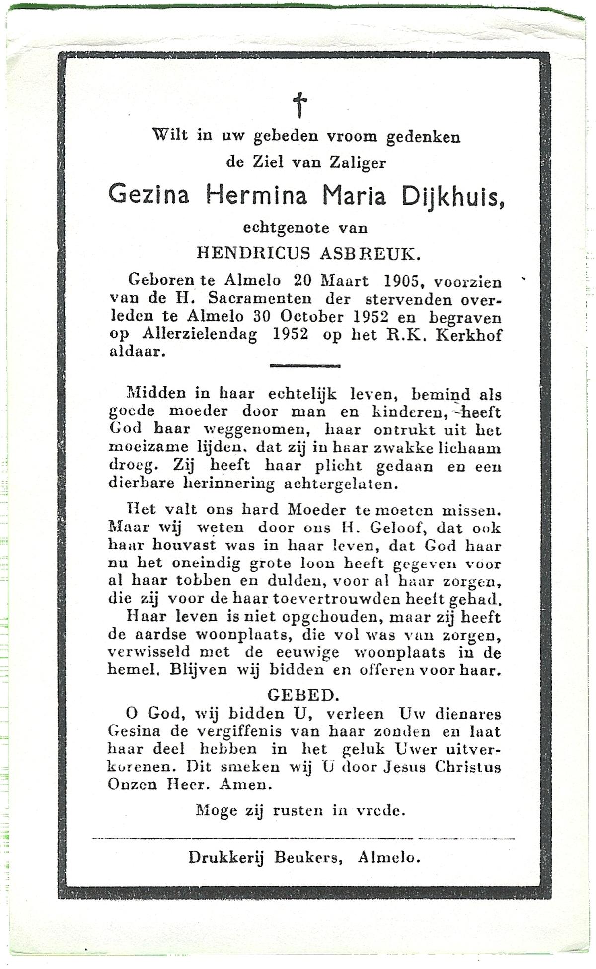 DIJKHUIS, Gezina Hermina Maria, geboren op 20-3-1905 te Almelo, overleden op 30-10-1952 te Almelo op 47-jarige leeftijd, begraven op 2-11-1952 te Almelo.