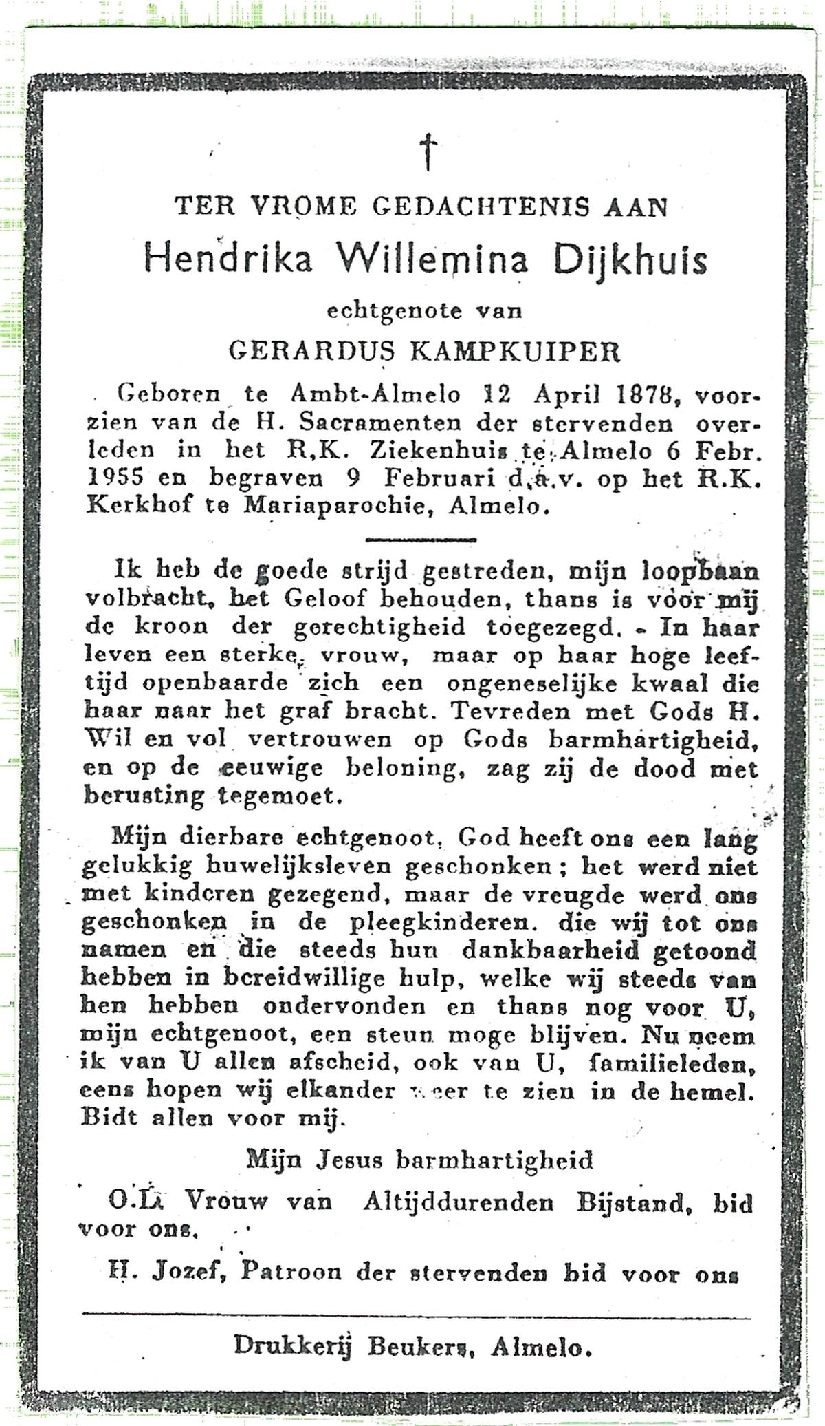 DIJKHUIS, Hendrika Willemina, geboren op 12-04-1878 te Almelo, Ambt, overleden op 6-2-1955 te Almelo op 76-jarige leeftijd, begraven op 9-2-1955 te Almelo.