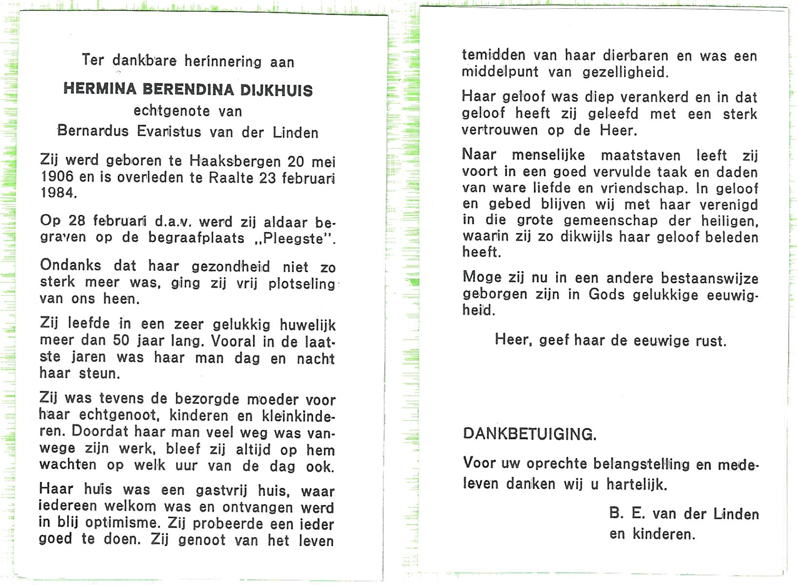 DIJKHUIS, Hermina Berendina, geboren op 20-5-1906 te Haaksbergen, overleden op 23-2-1984 te Raalte op 77-jarige leeftijd, begraven op 28-2-1984 te Raalte, Oleegste.