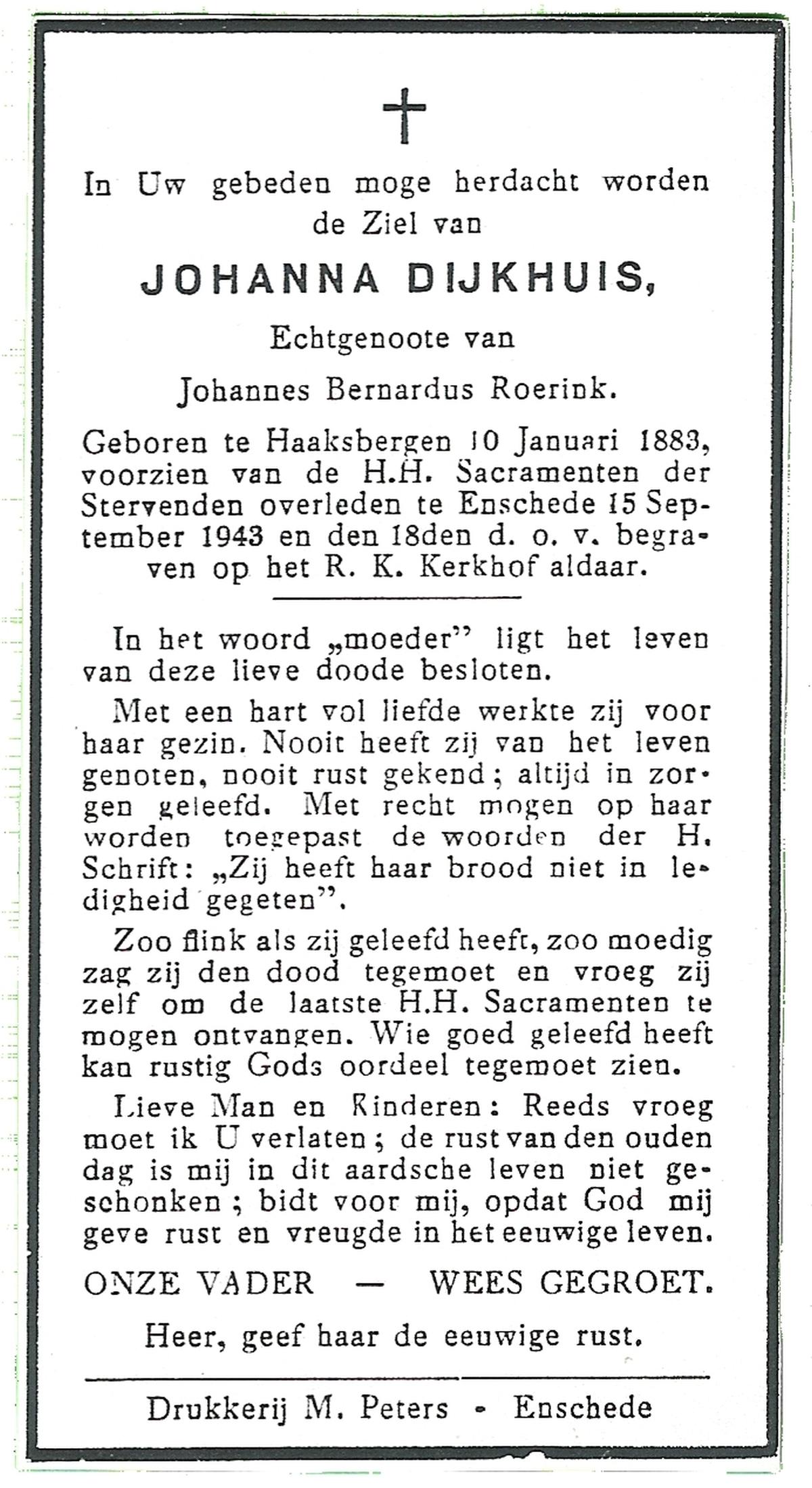 DIJKHUIS, Johanna, geboren op 10-01-1883 te Haaksbergen, overleden op 15-9-1943 te Enschede op 60-jarige leeftijd, begraven op 18-9-1943 te Enschede.