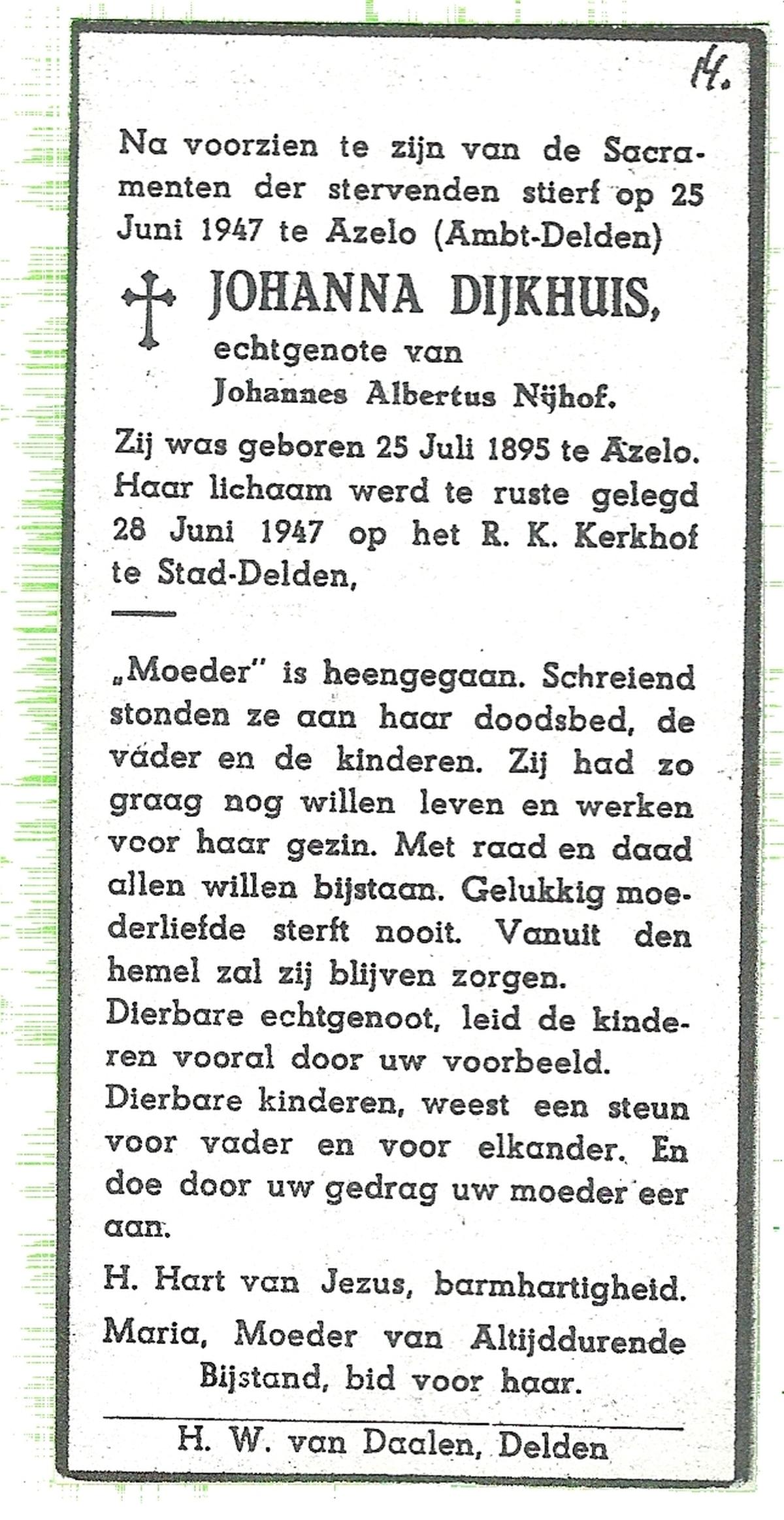 DIJKHUIS, Johanna, geboren op 25-07-1895 te Azelo, overleden op 25-6-1947 te Delden, Stad op 51-jarige leeftijd, begraven op 28-6-1947 te Delden, Stad.