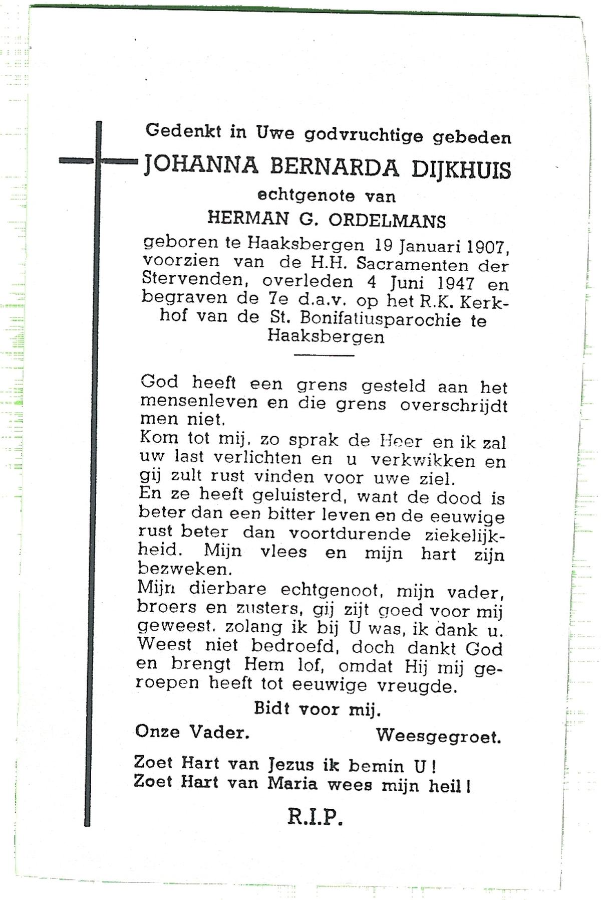 DIJKHUIS, Johanna Bernarda, geboren op 19-1-1907 te Haaksbergen, overleden op 4-6-1947 op 40-jarige leeftijd, begraven op 7-6-1947 te Haaksbergen, Bonifatius en Gezelleparochie.