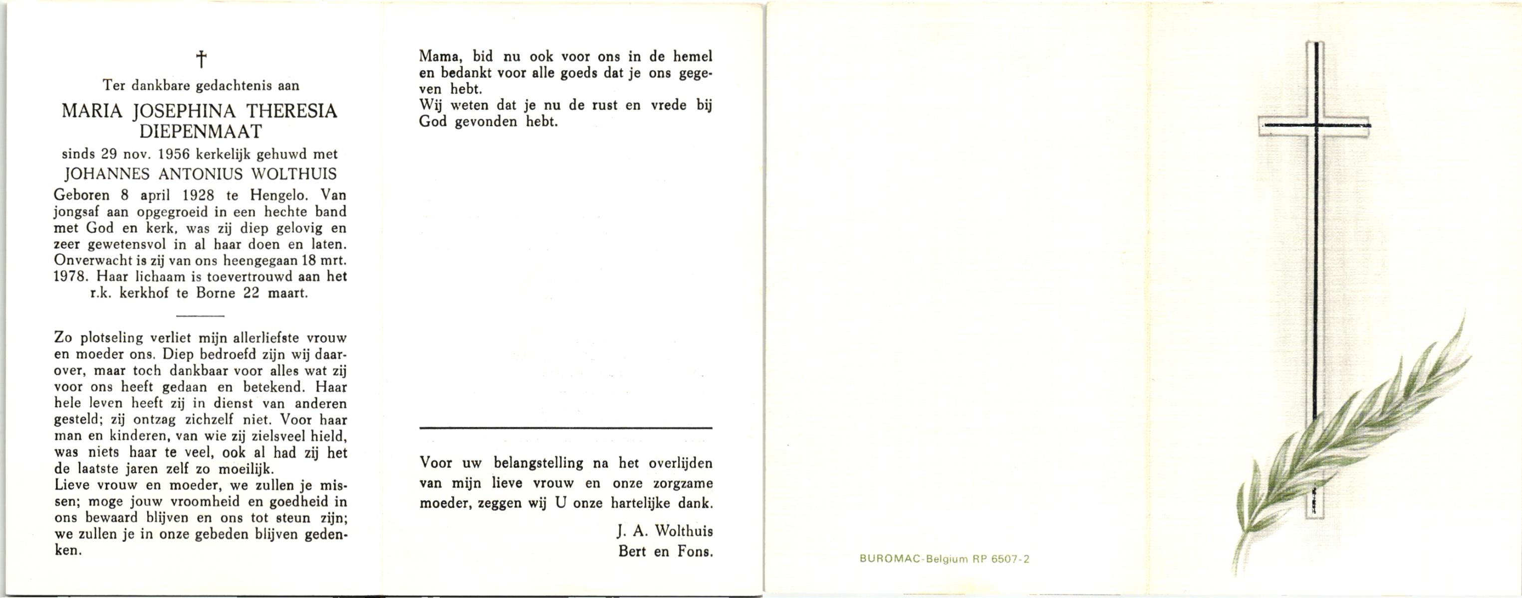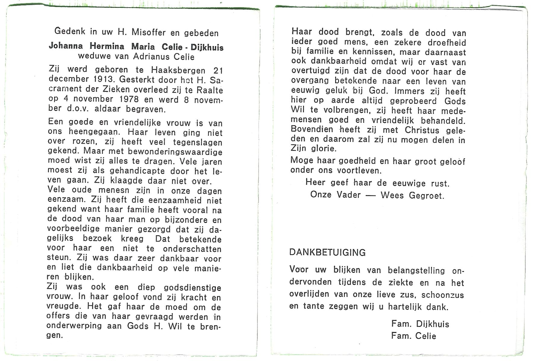 DIJKHUIS, Johanna Hermina Maria, geboren op 21-12-1913 te Haaksbergen, overleden op 4-11-1978 te Raalte op 64-jarige leeftijd, begraven op 8-11-1978 te Raalte.
