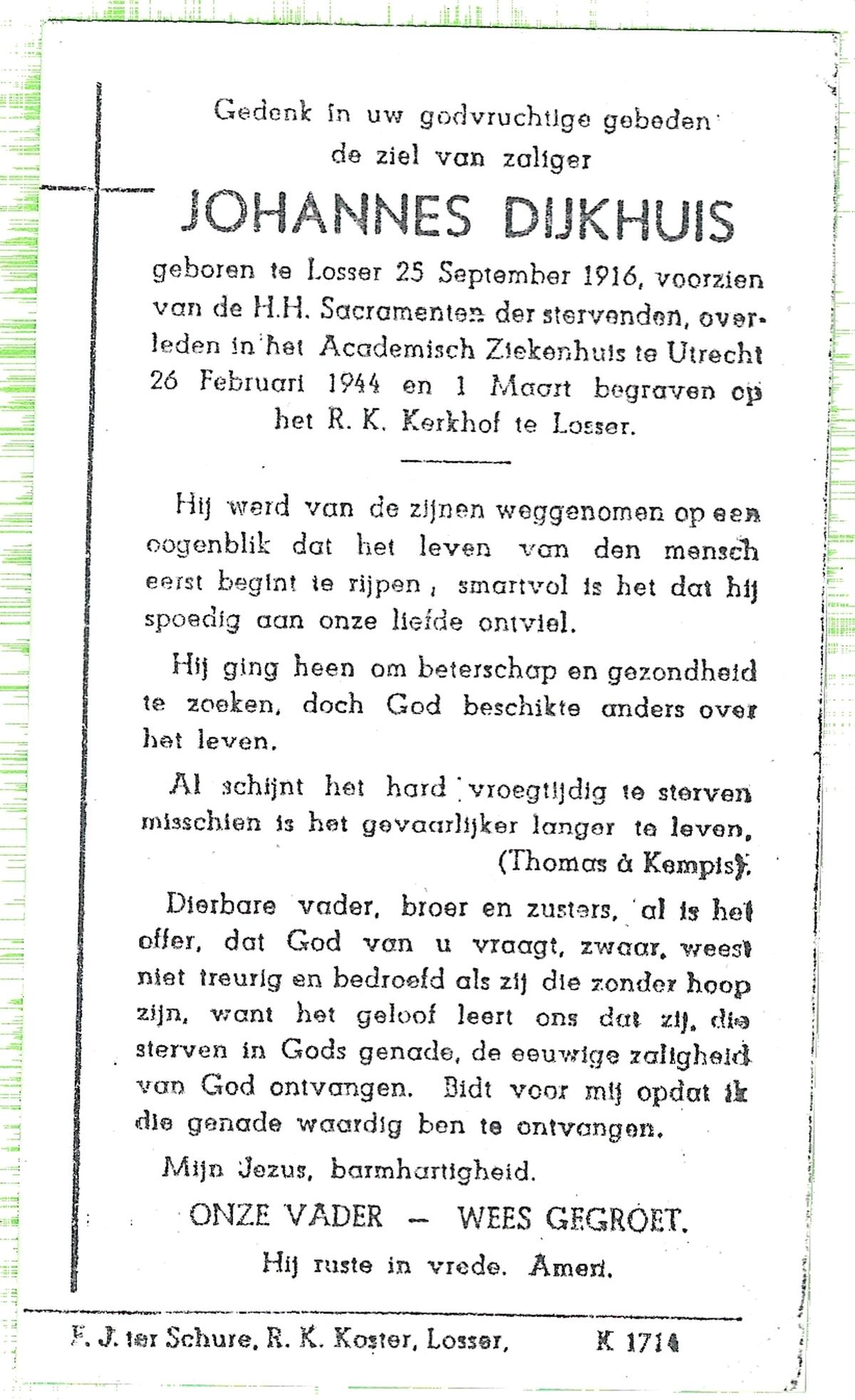 DIJKHUIS, Johannes, geboren op 25-9-1916 te Losser, overleden op 26-2-1944 te Utrecht op 27-jarige leeftijd, begraven op 1-3-1944 te Losser.