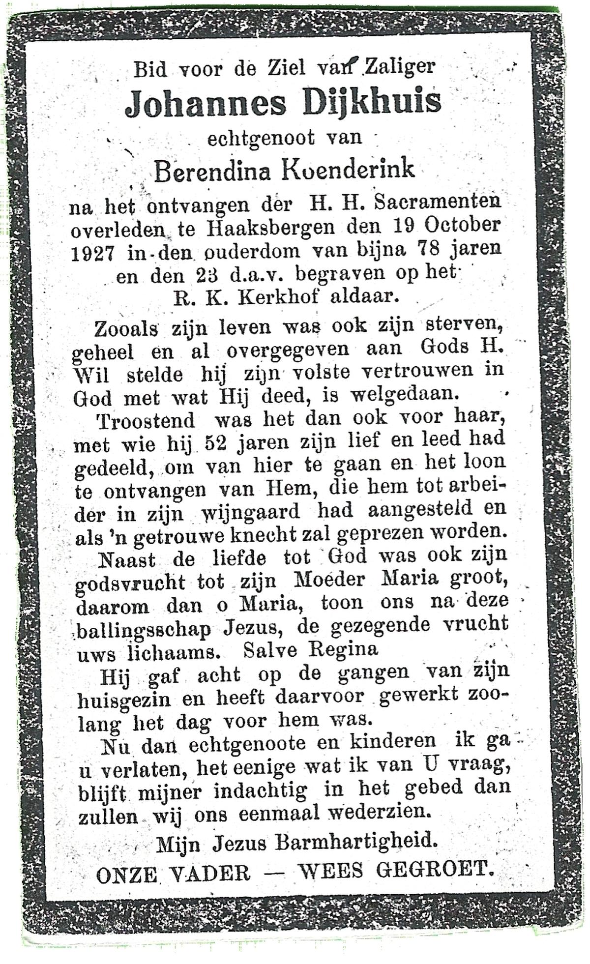 DIJKHUIS, Johannes, overleden op 19-10-1927 te Haaksbergen op 77-jarige leeftijd, begraven op 23-10-1927 te Haaksbergen.