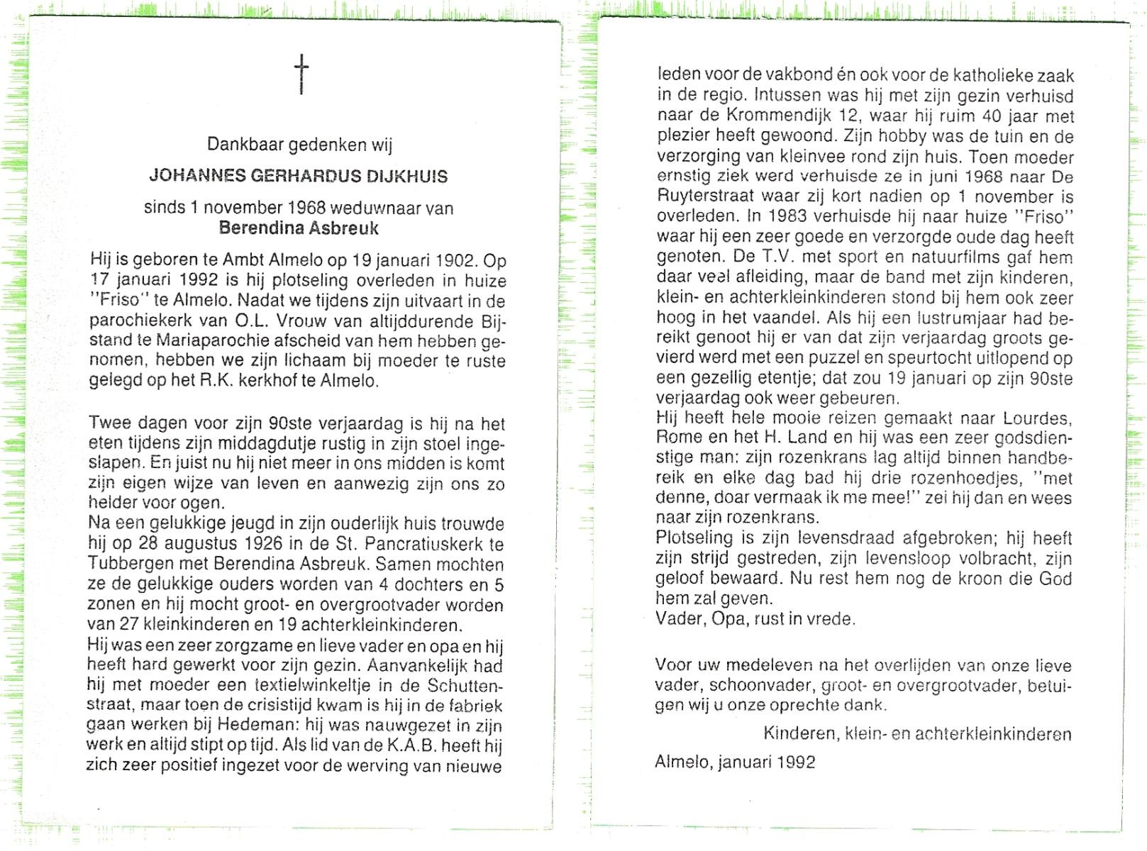 DIJKHUIS, Johannes Gerhardus, geboren op 19-1-1902 te Almelo, Ambt, overleden op 17-1-1992 te Almelo op 89-jarige leeftijd, begraven te Almelo.