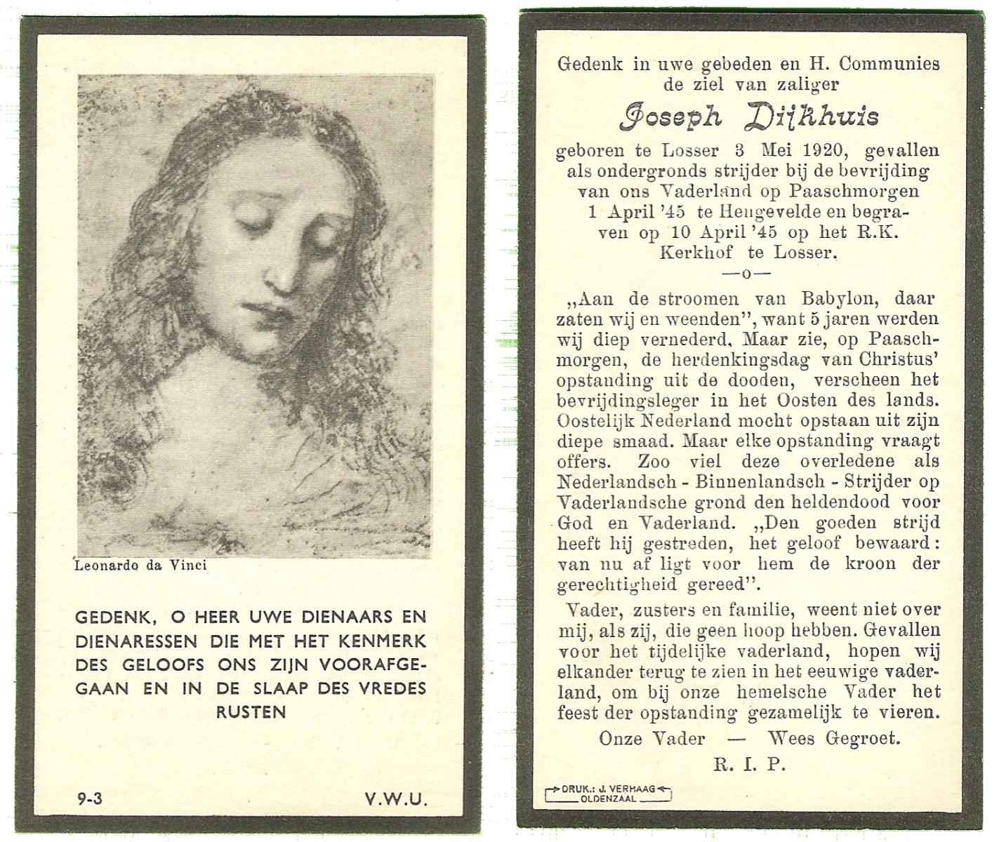 DIJKHUIS, Joseph, geboren op 3-5-1920 te Losser, overleden op 1-4-1945 te Hengevelde op 24-jarige leeftijd, begraven op 10-4-1945 te Losser.