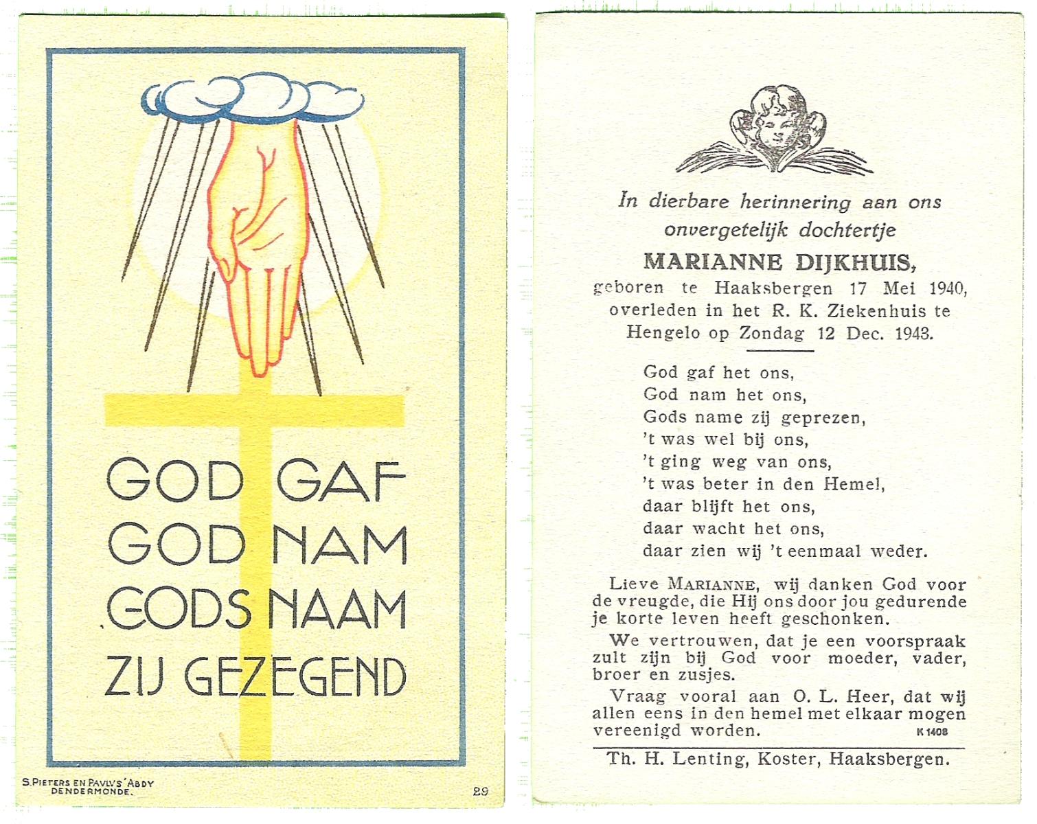 DIJKHUIS, Marianne, geboren op 17-5-1940 te Haaksbergen, overleden op 12-12-1943 te Hengelo (Ov.) op 3-jarige leeftijd.