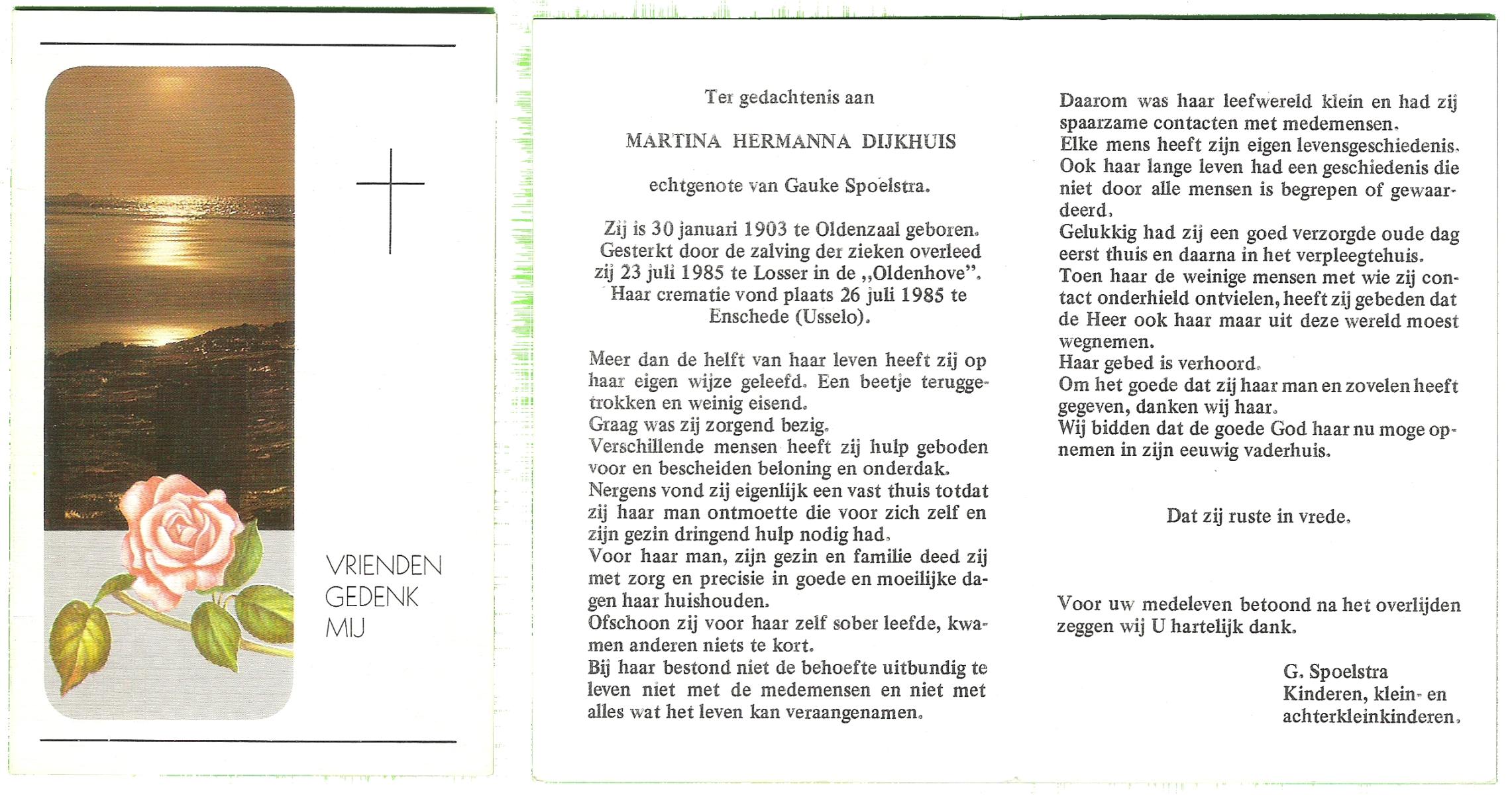 DIJKHUIS, Martina Hermanna, geboren op 30-1-1903 te Oldenzaal, overleden op 23-7-1985 te Losser op 82-jarige leeftijd, gecremeerd op 26-7-1985 te Usselo.