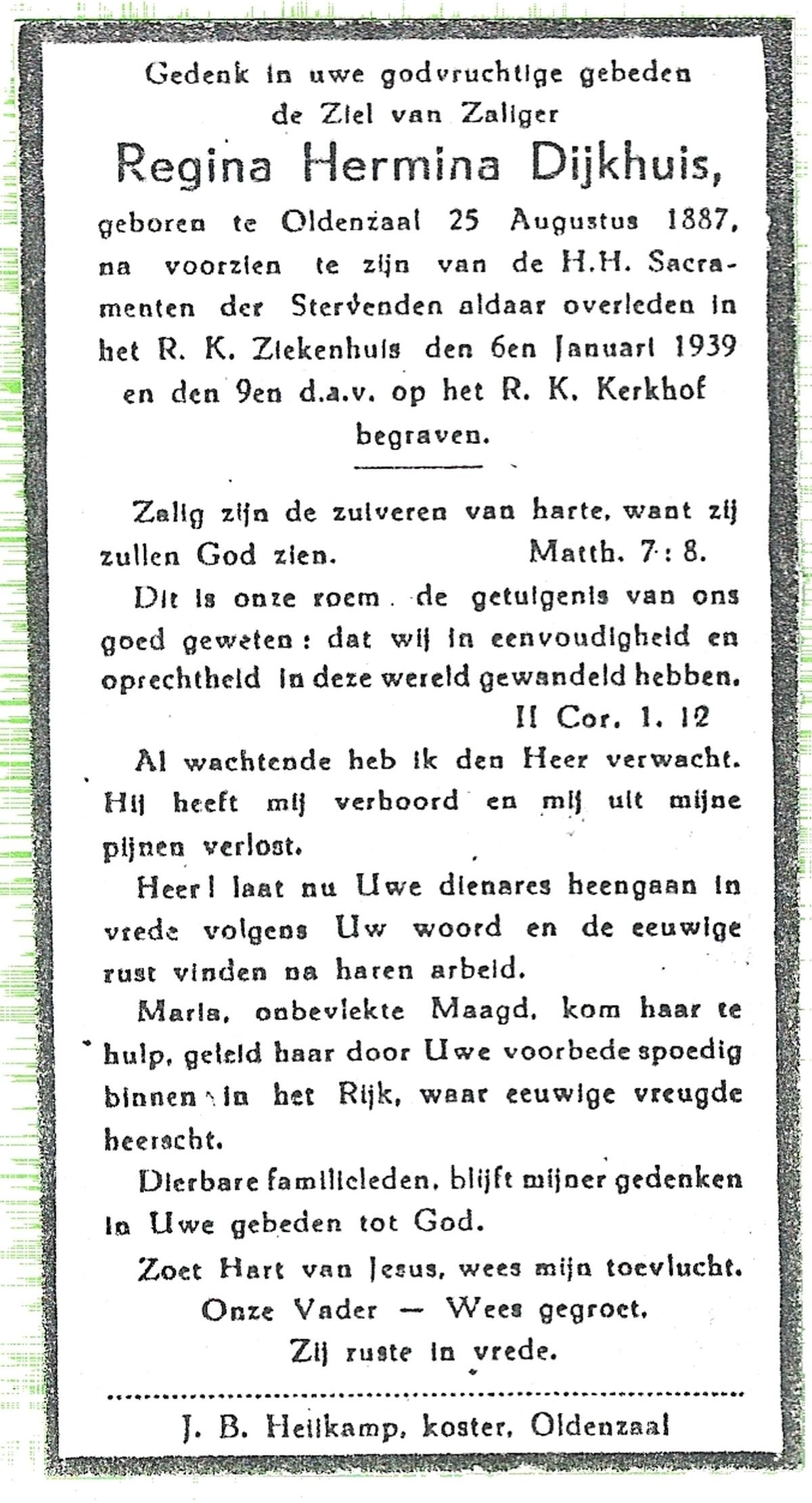 DIJKHUIS, Regina Hermina, geboren op 25-08-1887 te Oldenzaal, overleden op 6-1-1939 op 51-jarige leeftijd, begraven op 9-1-1939.