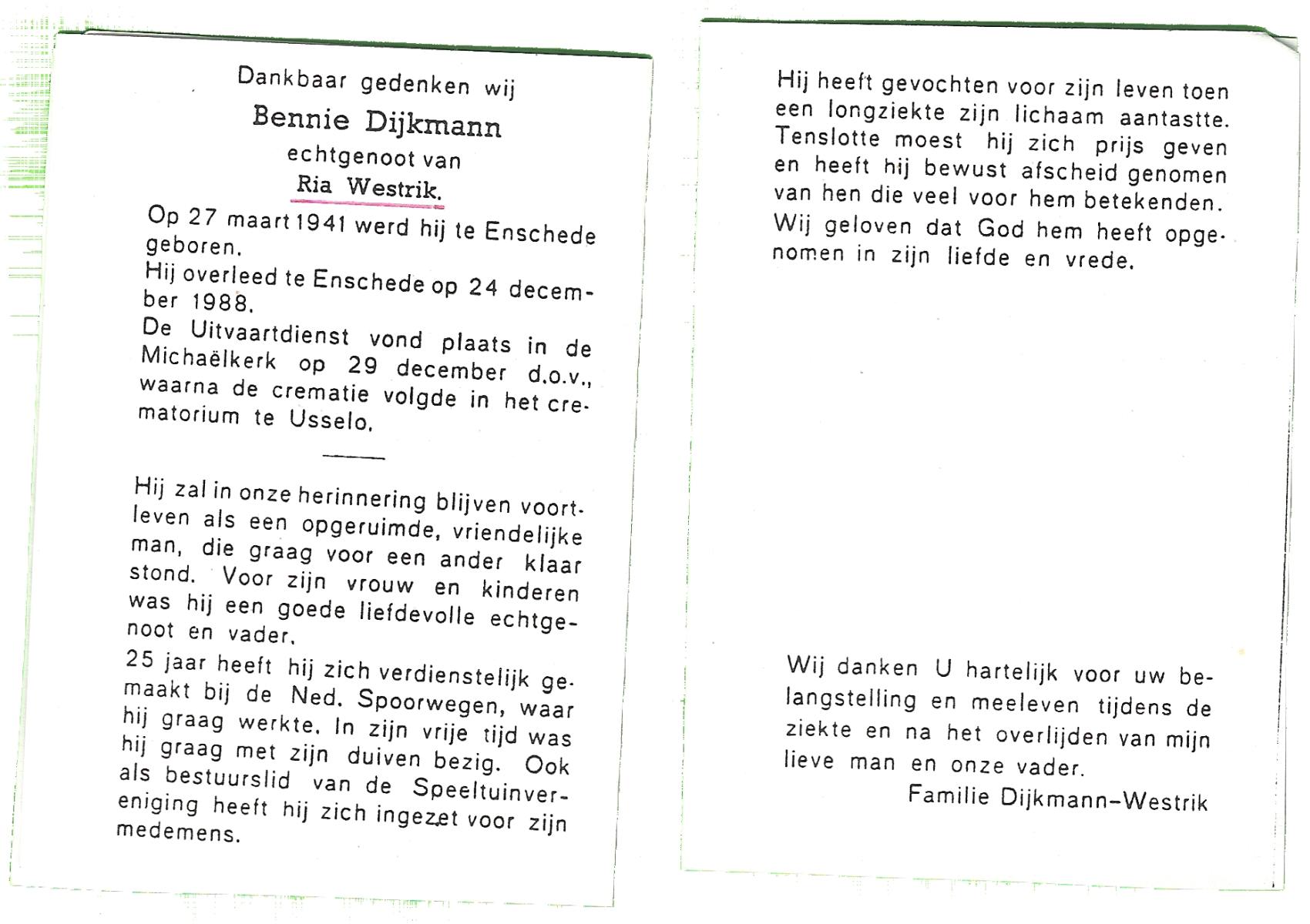 DIJKMAN, Bennie, geboren op 27-3-1941 te Enschede, overleden op 24-12-1988 te Enschede op 47-jarige leeftijd, gecremeerd op 29-12-1988 te Usselo.