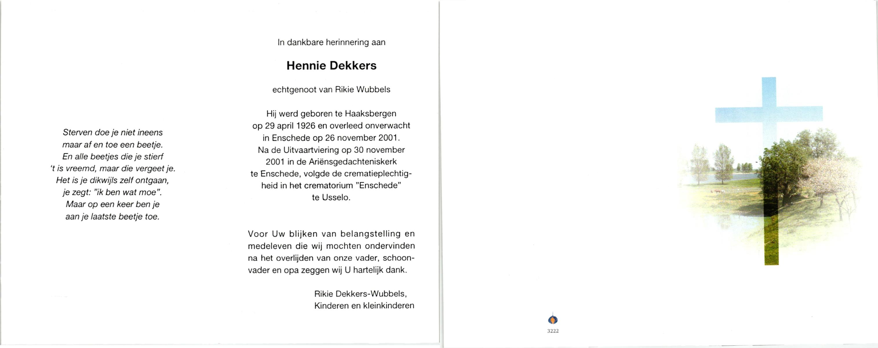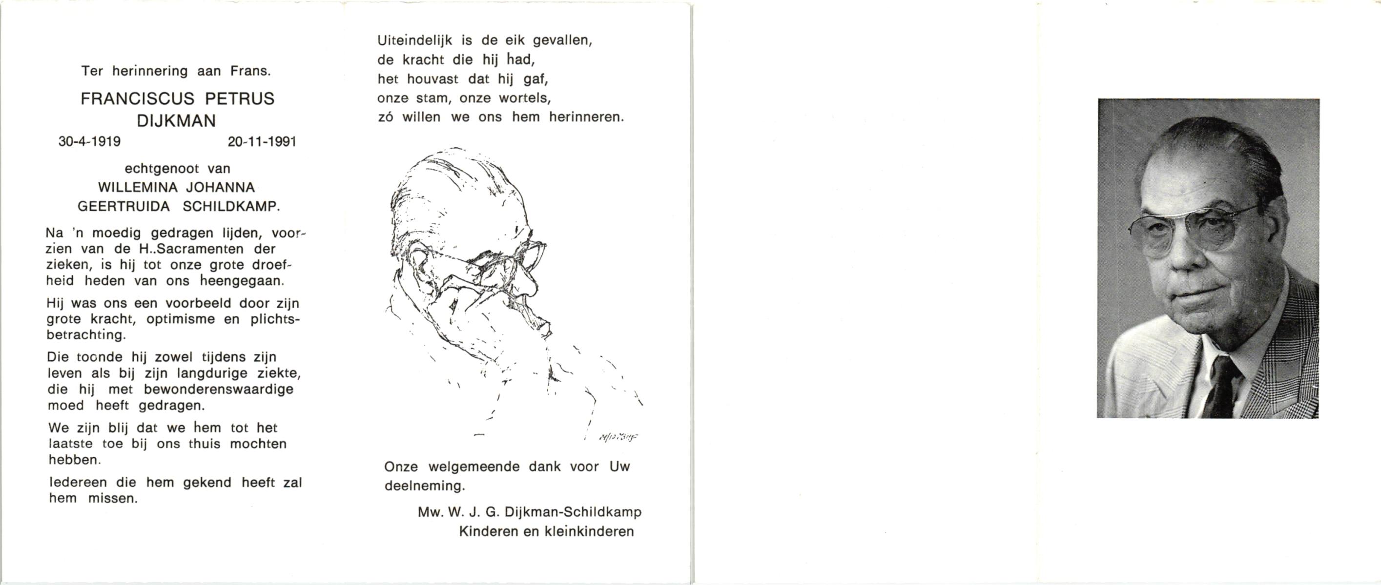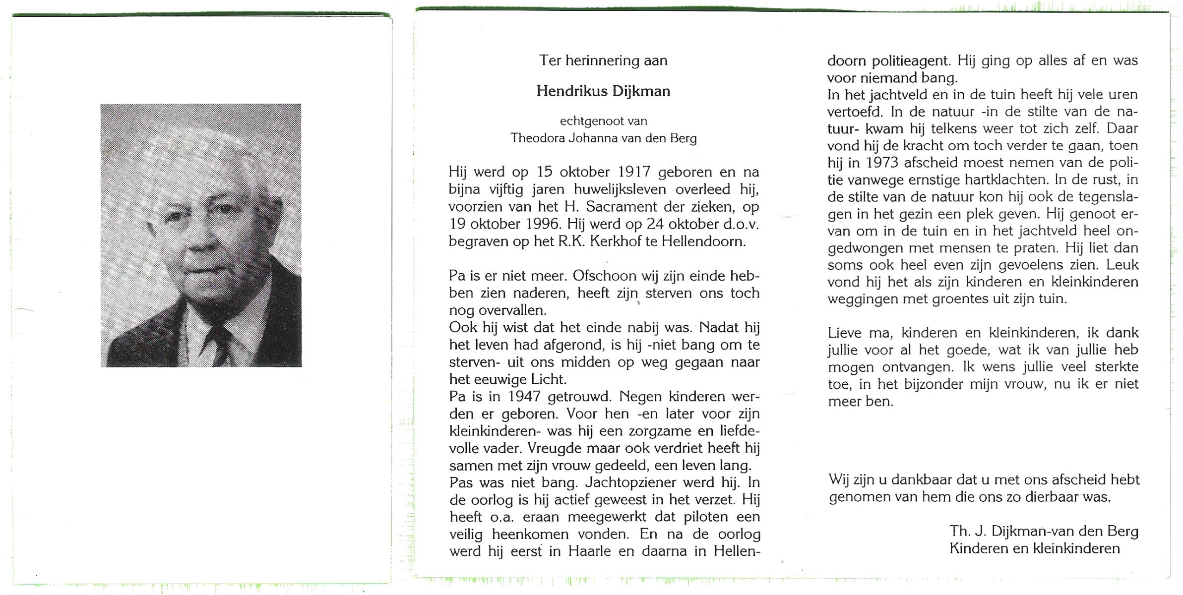 DIJKMAN, Hendrikus, geboren op 15-10-1917, overleden op 19-10-1996 op 81-jarige leeftijd, begraven op 24-10-1996 te Hellendoorn.