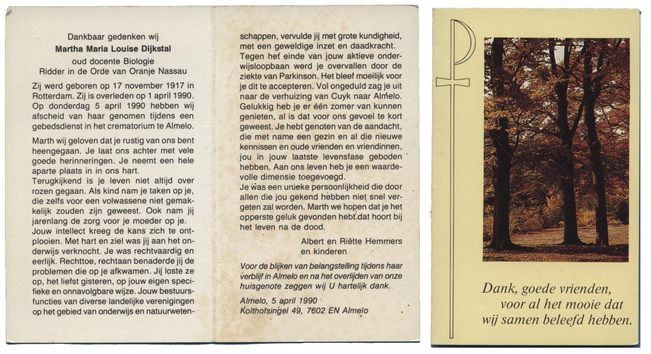 DIJKSTAL, Martha Maria Louise, geboren op 17-11-1917 te Rotterdam, overleden op 1-4-1990 te Almelo op 72-jarige leeftijd, gecremeerd op 5-4-1990 te Almelo.