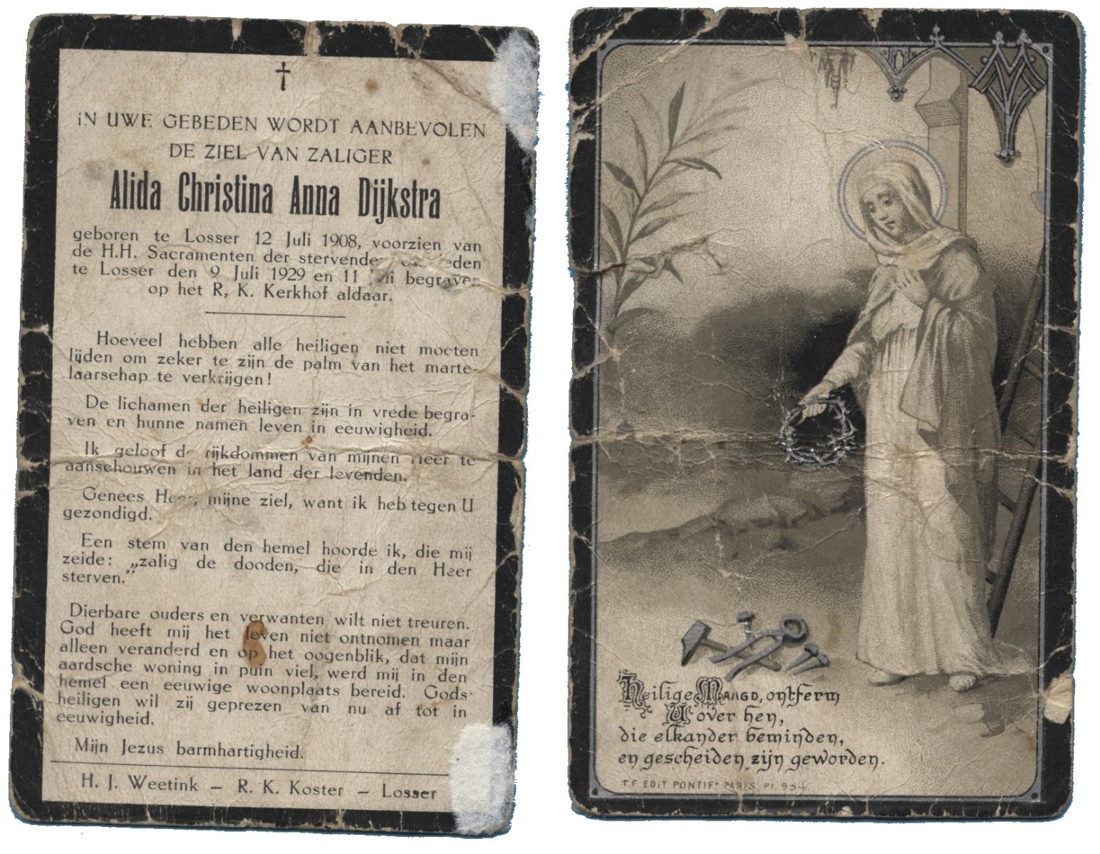 DIJKSTRA, Alida Christina Anna, geboren op 12-7-1908 te Losser, overleden op 9-7-1929 te Losser op 20-jarige leeftijd, begraven op 11-7-1929 te Losser.