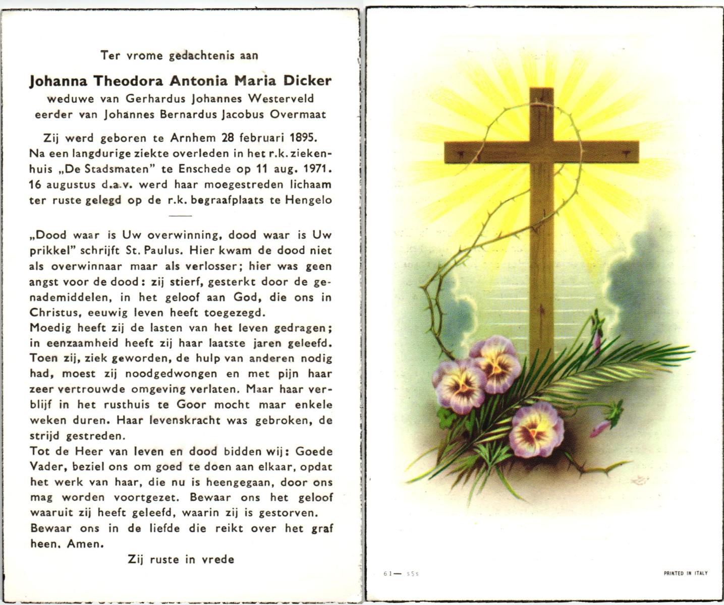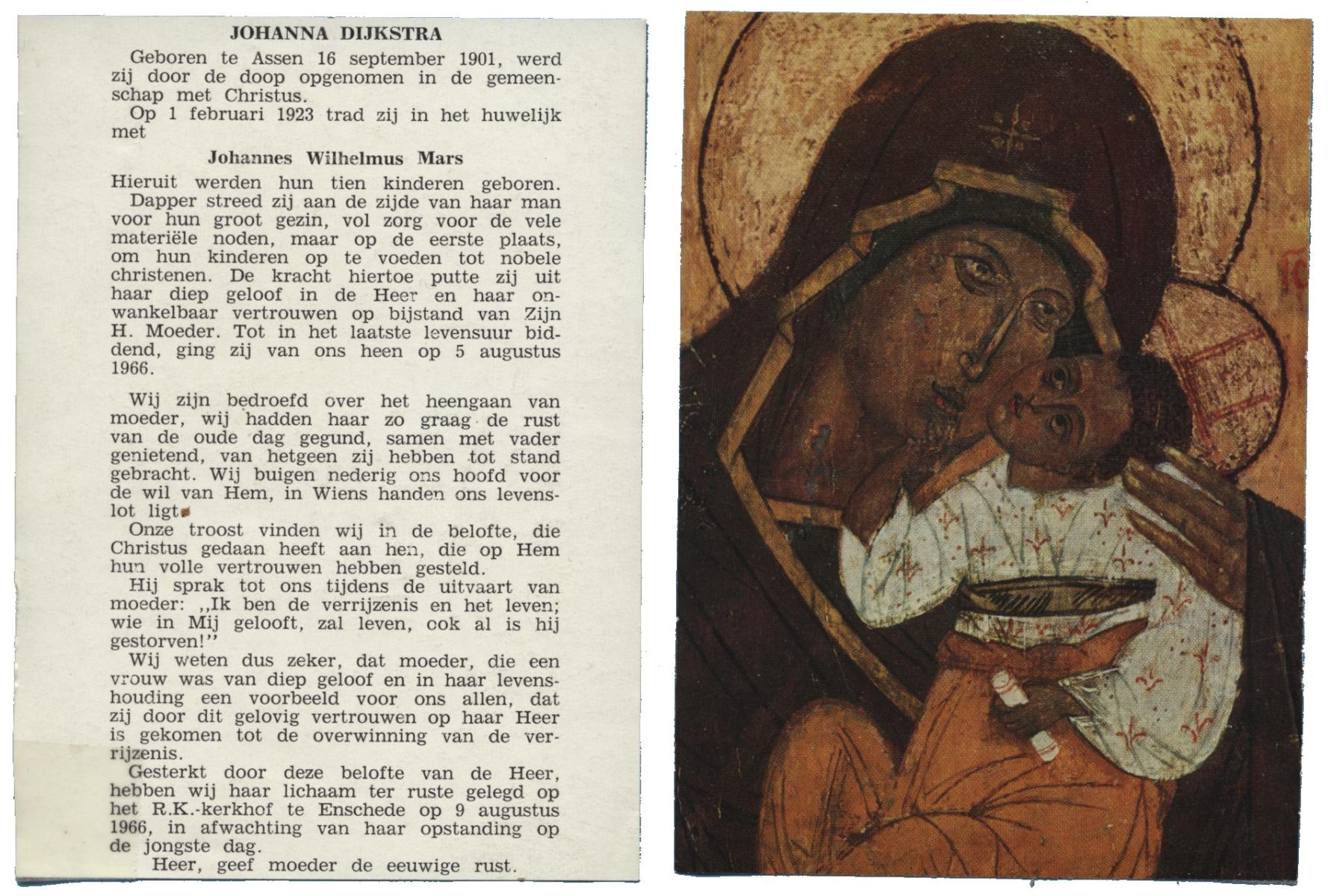 DIJKSTRA, Johanna, geboren op 16-9-1901 te Assen, overleden op 5-8-1966 op 64-jarige leeftijd, begraven op 9-8-1966 te Enschede.
