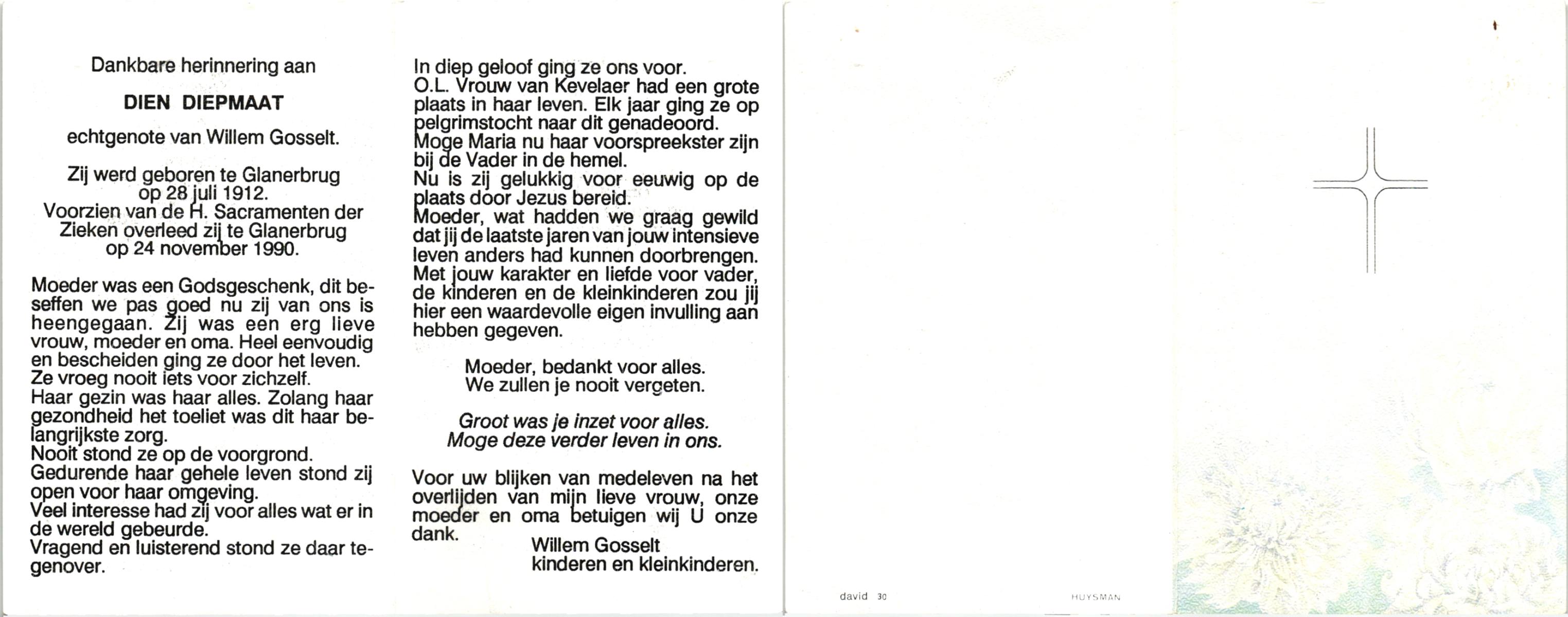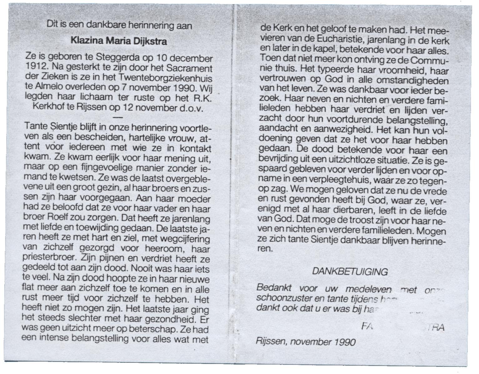 DIJKSTRA, Klazina Maria, geboren op 10-12-1912 te Steggerda, overleden op 7-11-1990 te Almelo op 77-jarige leeftijd, begraven op 12-11-1990 te Rijssen.
