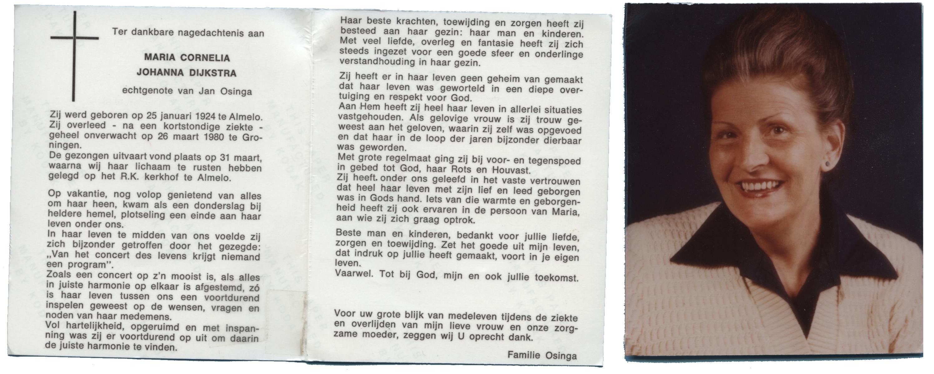 DIJKSTRA, Maria Cornelia Johanna, geboren op 25-1-1924 te Almelo, overleden op 26-3-1980 te Groningen op 56-jarige leeftijd, begraven op 31-3-1980 te Almelo.
