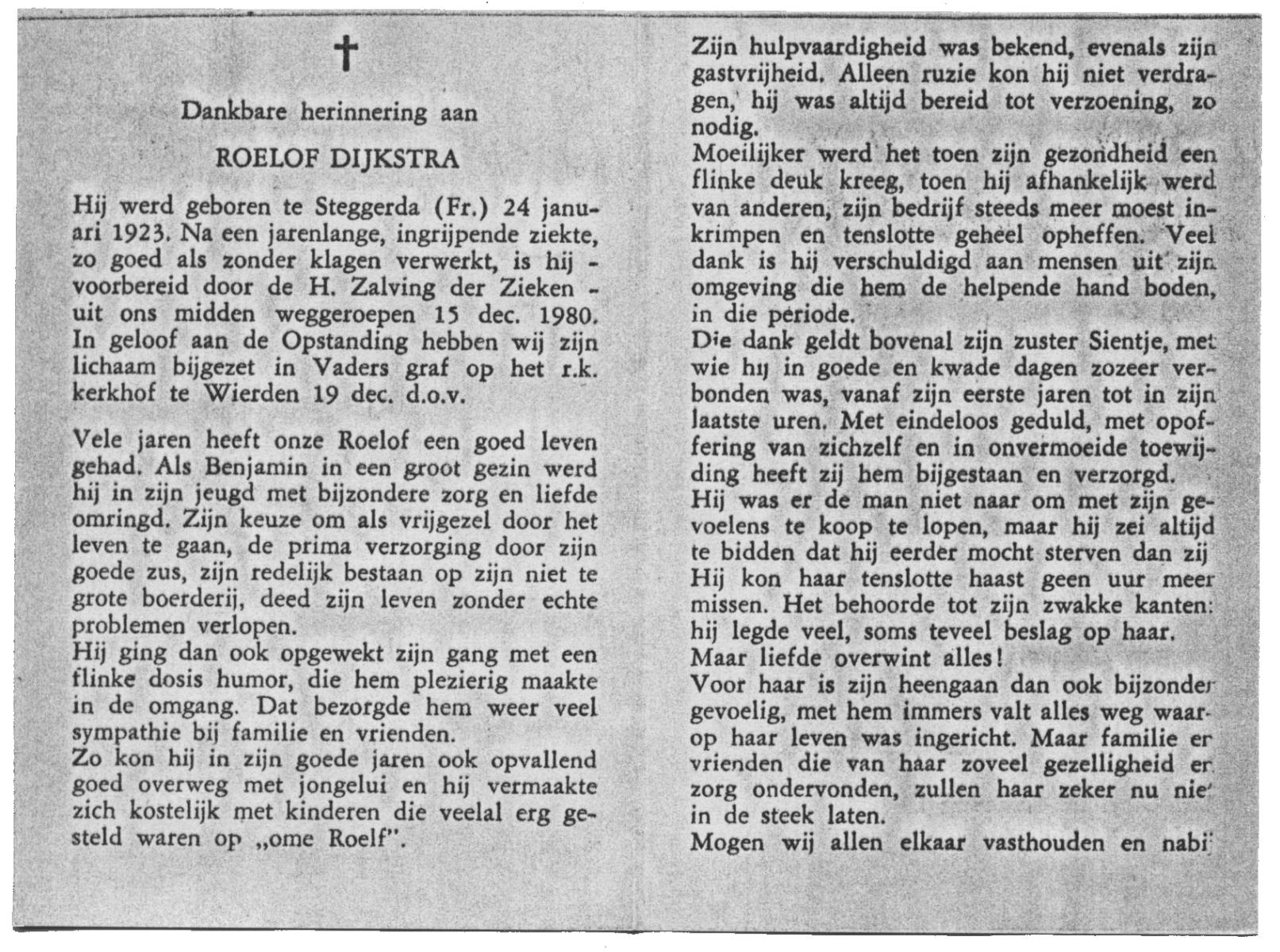 DIJKSTRA, Roelof, geboren op 24-1-1923 te Steggerda, overleden op 15-12-1980 op 57-jarige leeftijd, begraven op 19-12-1980 te Wierden.