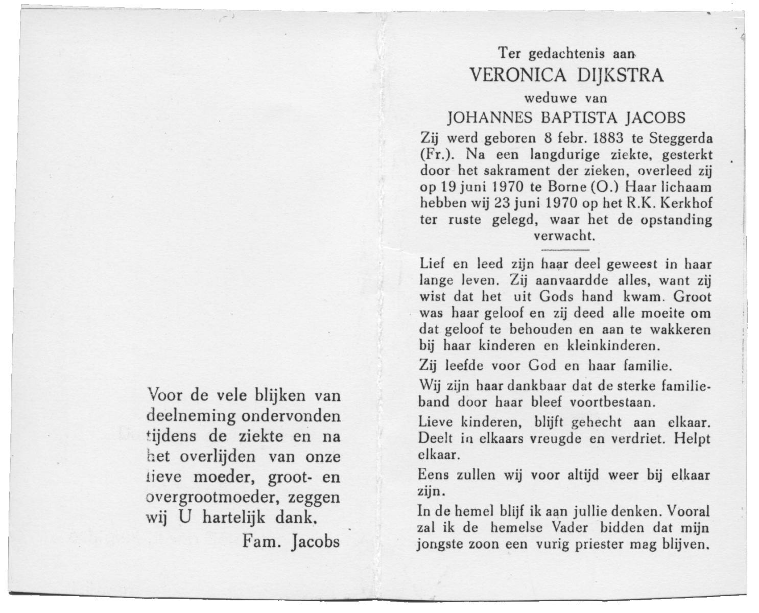 DIJKSTRA, Veronica, geboren op 08-02-1883 te Steggerda, overleden op 19-6-1970 te Borne op 87-jarige leeftijd, begraven op 23-6-1970.