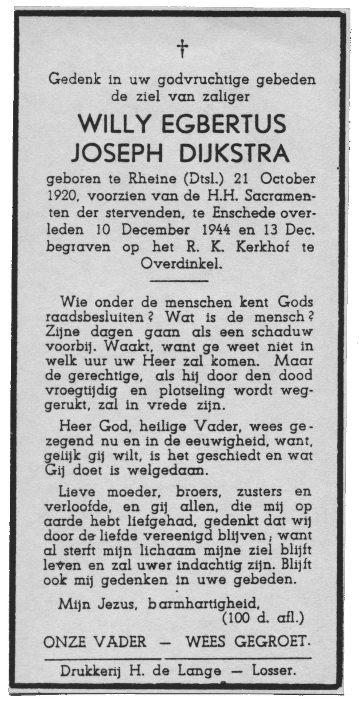 DIJKSTRA, Willy Egbertus Joseph, geboren op 21-10-1920 te Rheine (Dld.), overleden op 10-12-1944 te Enschede op 24-jarige leeftijd, begraven op 13-12-1944 te Overdinkel.