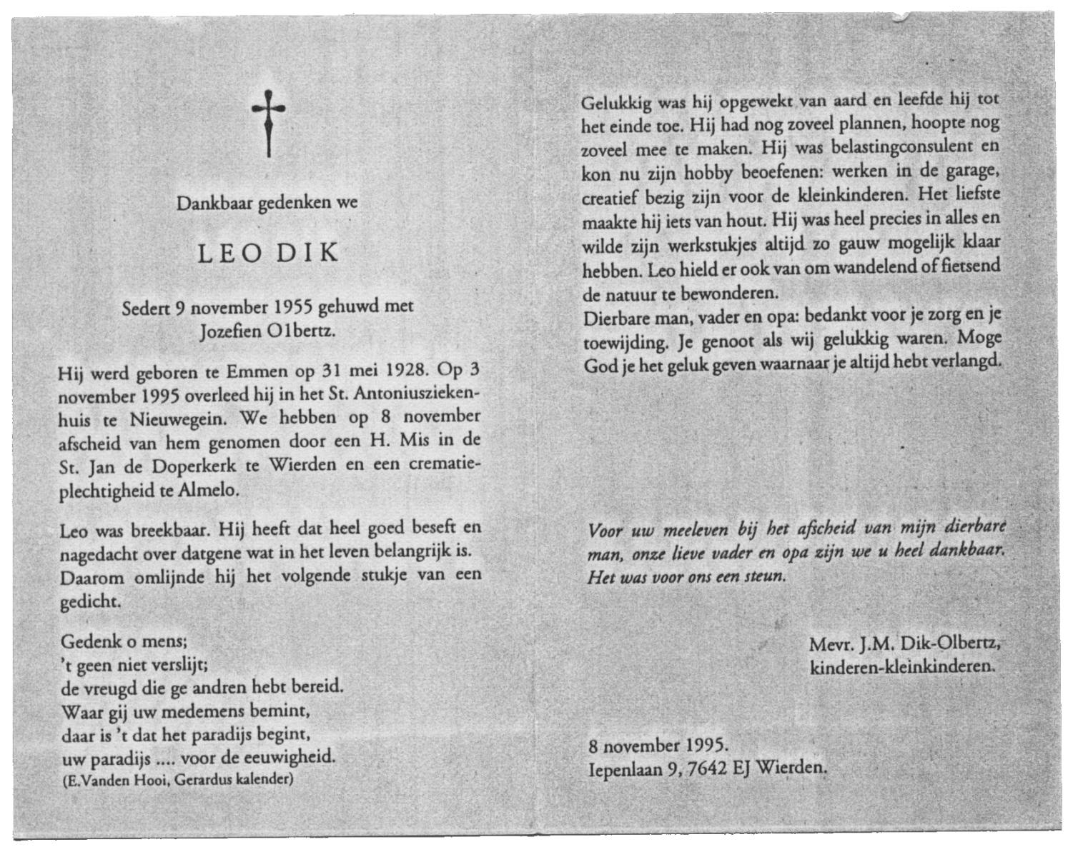 DIK, Leo, geboren op 31-5-1928 te Emmen, overleden op 3-11-1995 te Nieuwegein op 67-jarige leeftijd, gecremeerd op 8-11-1995 te Almelo.