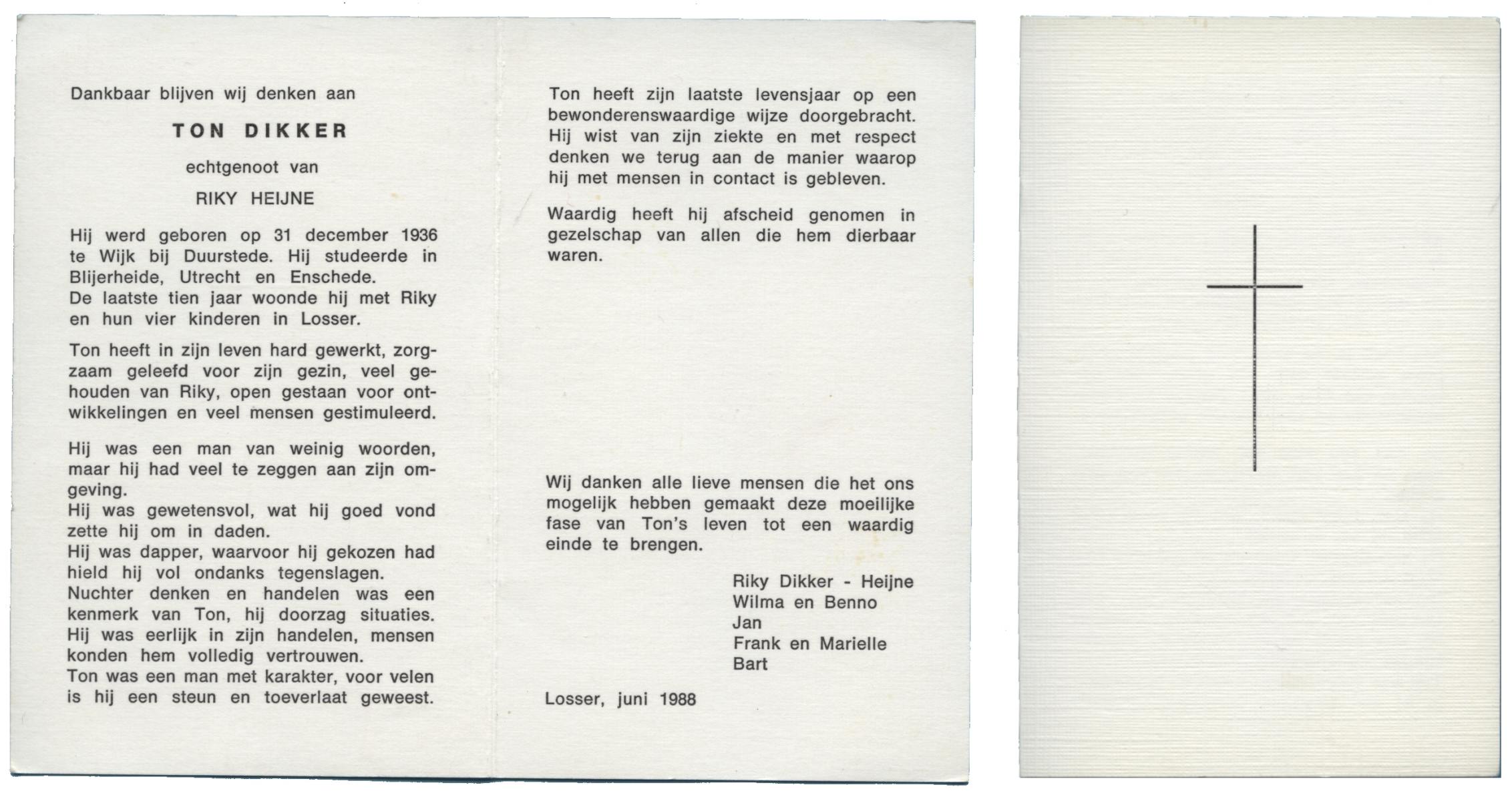 DIKKER, Ton, geboren op 31-12-1936 te Wijk bij Duurstede, overleden op 00-06-1988 te Losser op 51-jarige leeftijd.
