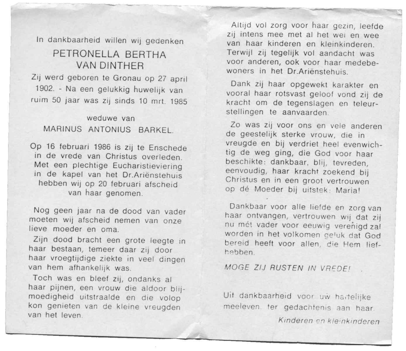 DINTHER, van, Petronella Bertha, geboren op 27-4-1902 te Gronau (Dld.), overleden op 16-2-1986 te Enschede op 83-jarige leeftijd.