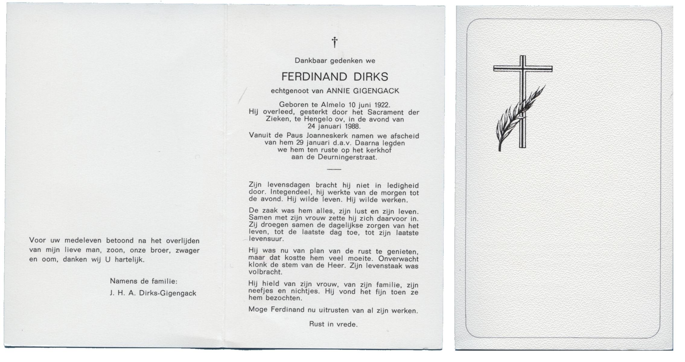 DIRKS, Ferdinand, geboren op 10-6-1922 te Almelo, overleden op 24-1-1988 te Hengelo (Ov.) op 65-jarige leeftijd, begraven op 29-1-1988 te Hengelo (Ov.).