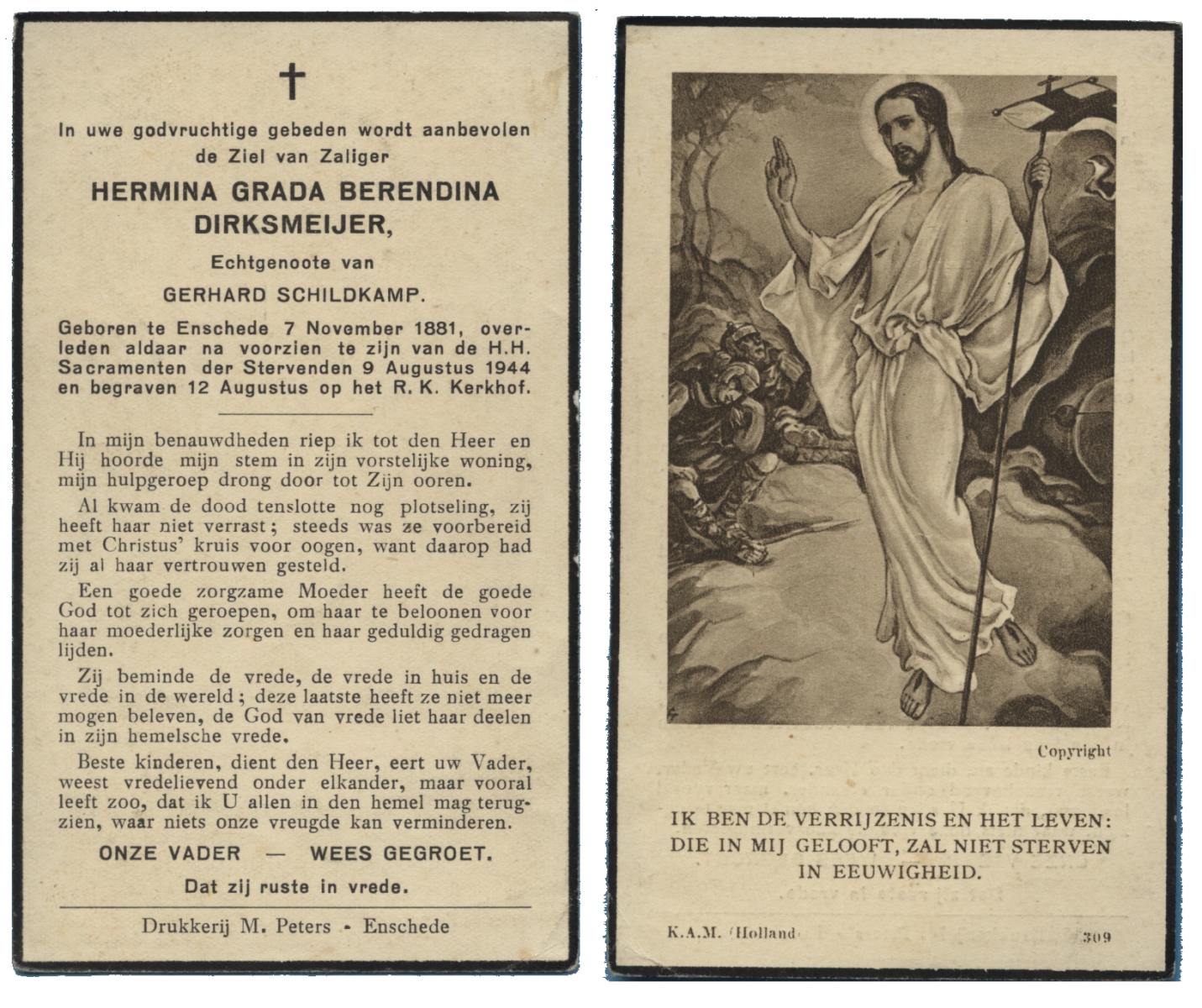 DIRKSMEIJER, Hermina Grada Berndina, geboren op 07-11-1881 te Enschede, overleden op 9-8-1944 te Enschede op 62-jarige leeftijd, begraven op 12-8-1944 te Enschede.