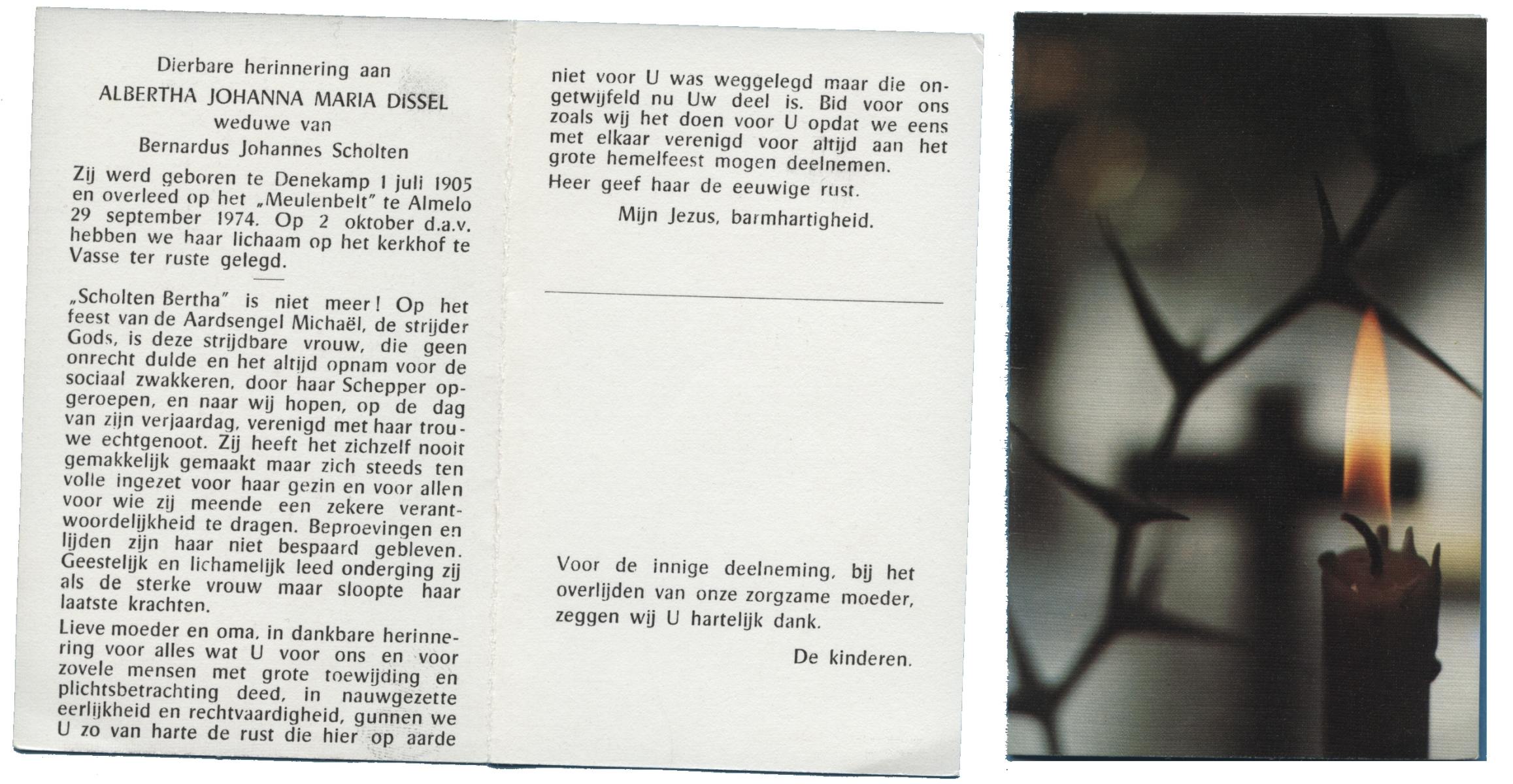 DISSEL, Albertha Johanna Maria, geboren op 1-7-1905 te Denekamp, overleden op 29-9-1974 te Almelo op 69-jarige leeftijd, begraven op 2-10-1974 te Vasse.