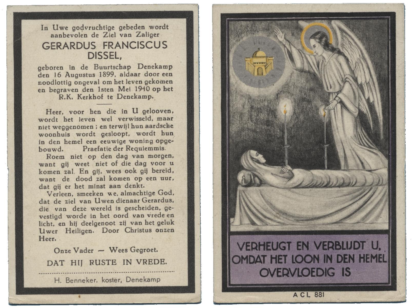 DISSEL, Gerardus Franciscus, geboren op 16-08-1899 te Denekamp, overleden te Denekamp op 40-jarige leeftijd, begraven op 1-5-1940 te Denekamp.