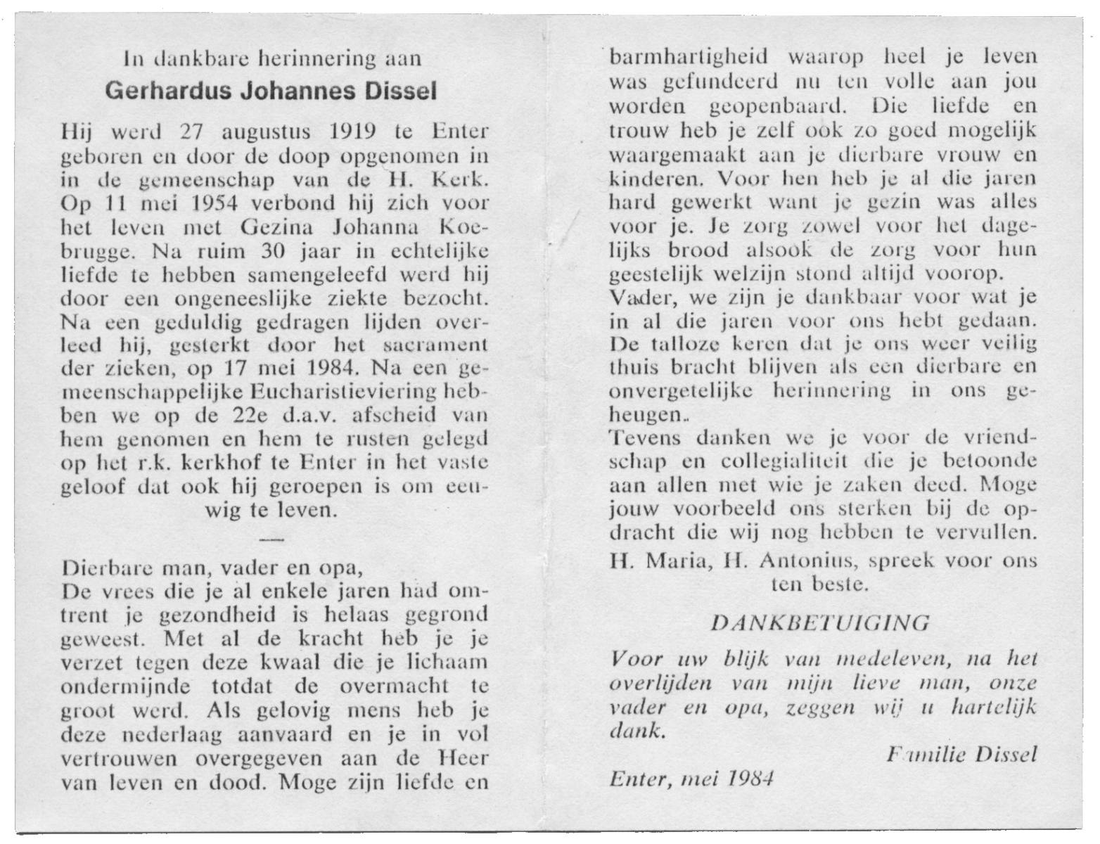 DISSEL, Gerhardus Johannes, geboren op 27-8-1919 te Enter, overleden op 17-5-1984 op 64-jarige leeftijd, begraven op 22-5-1984 te Enter.