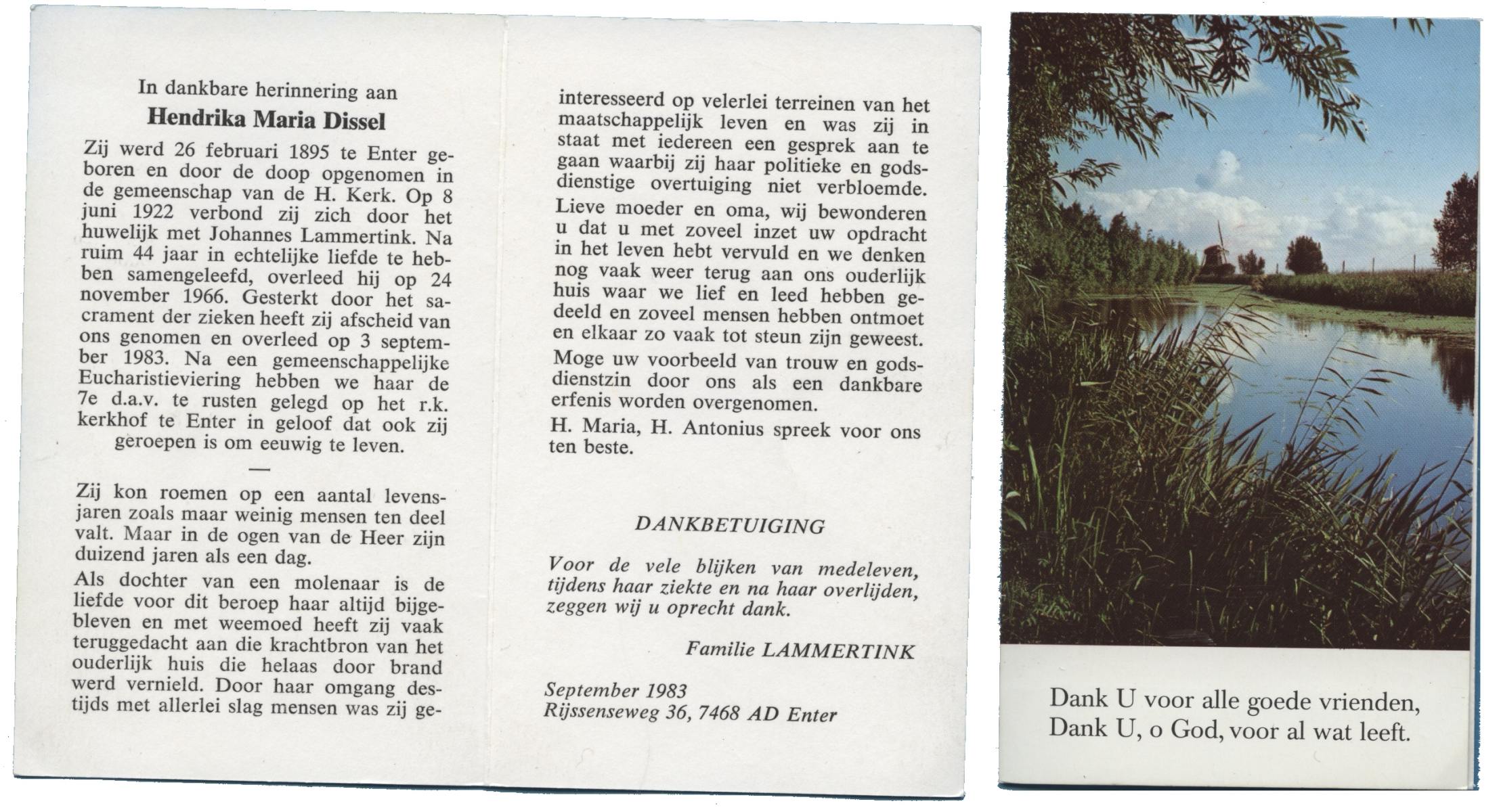 DISSEL, Hendrika Maria, geboren op 26-02-1895 te Wierden, Enter, overleden op 3-9-1983 op 88-jarige leeftijd, begraven op 7-9-1983 te Wierden, Enter.