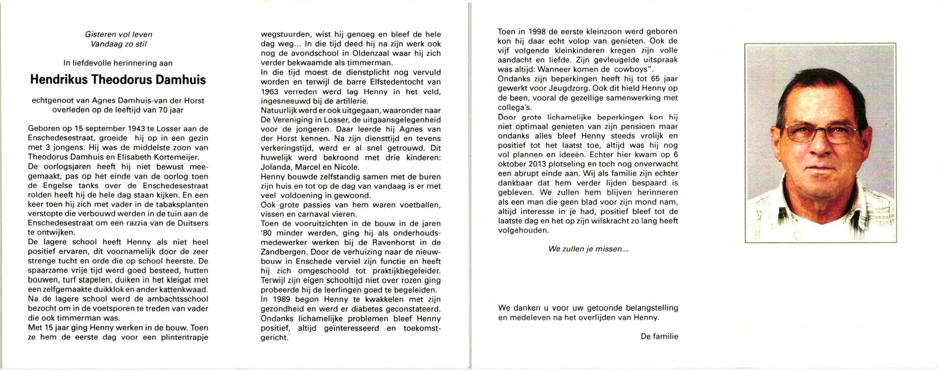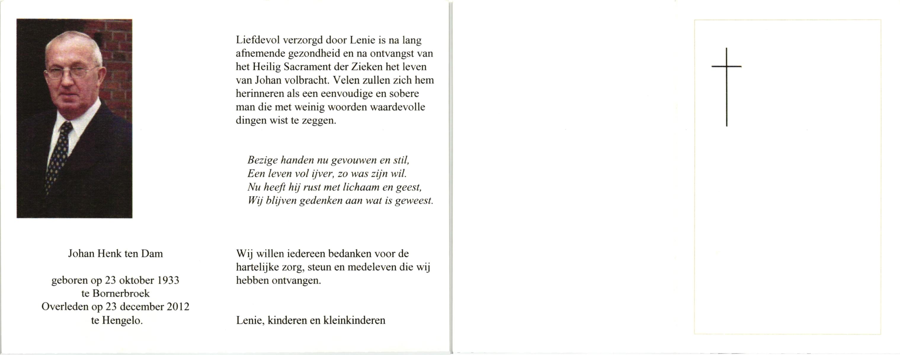 DAM, ten, Johan Henk, geboren op 23-10-1933 te Bornerbroek, overleden op 23-12-2012 te Hengelo (O) op 79-jarige leeftijd.