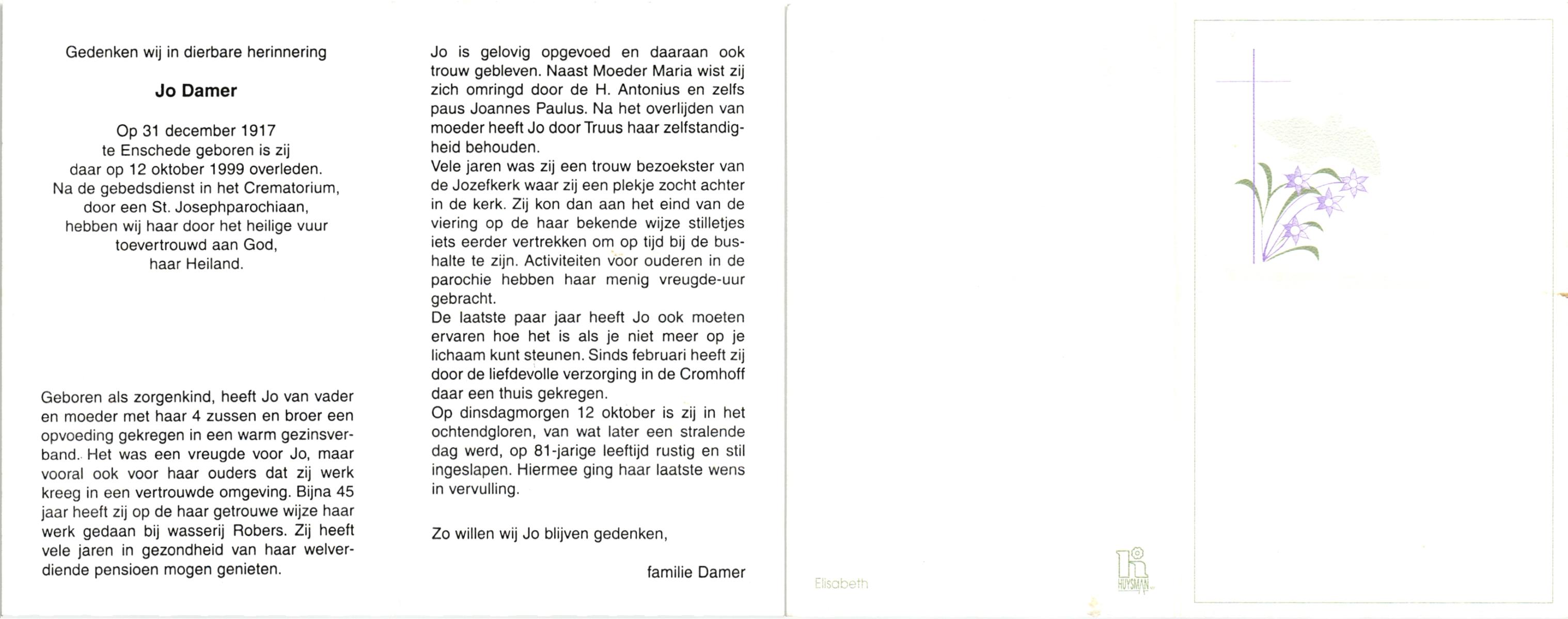 DAMER, , Jo, geboren op 31-12-1917 te Enschede, overleden op 12-10-1999 te Enschede op 81-jarige leeftijd, gecremeerd te Usselo.