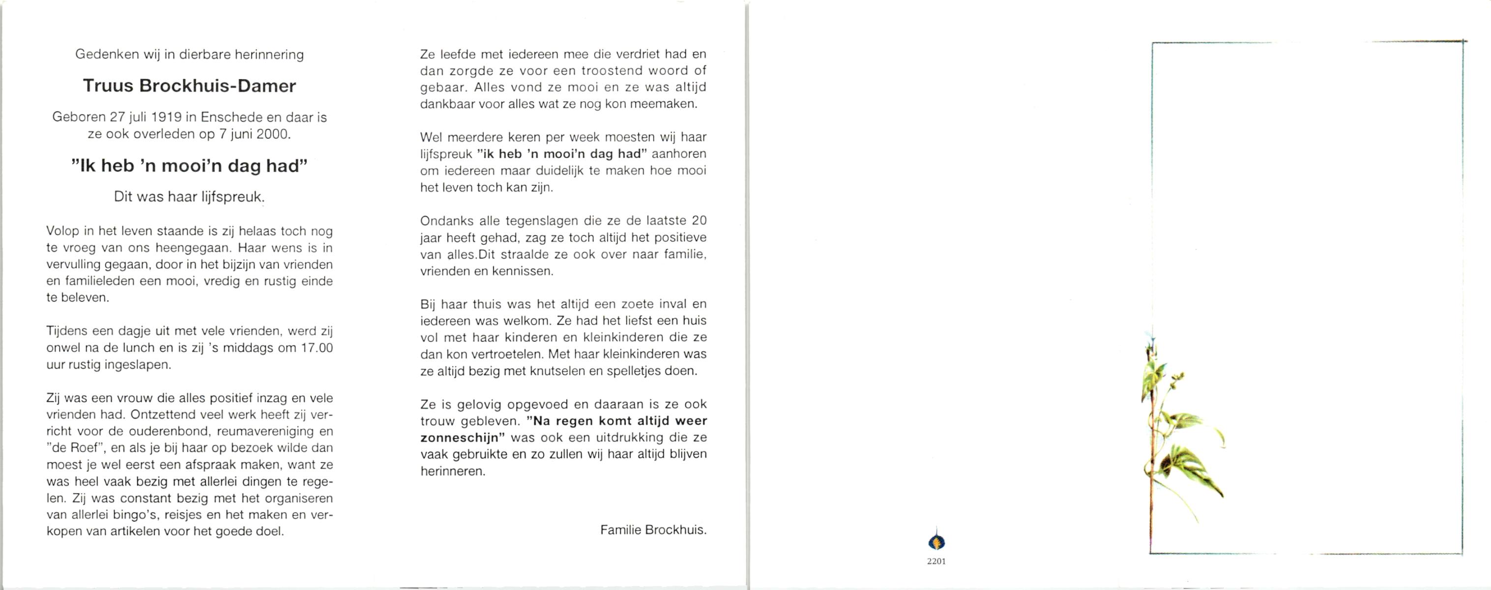 DAMER, , Truus, geboren op 27-7-1919 te Enschede, overleden op 7-6-2000 te Enschede op 80-jarige leeftijd.