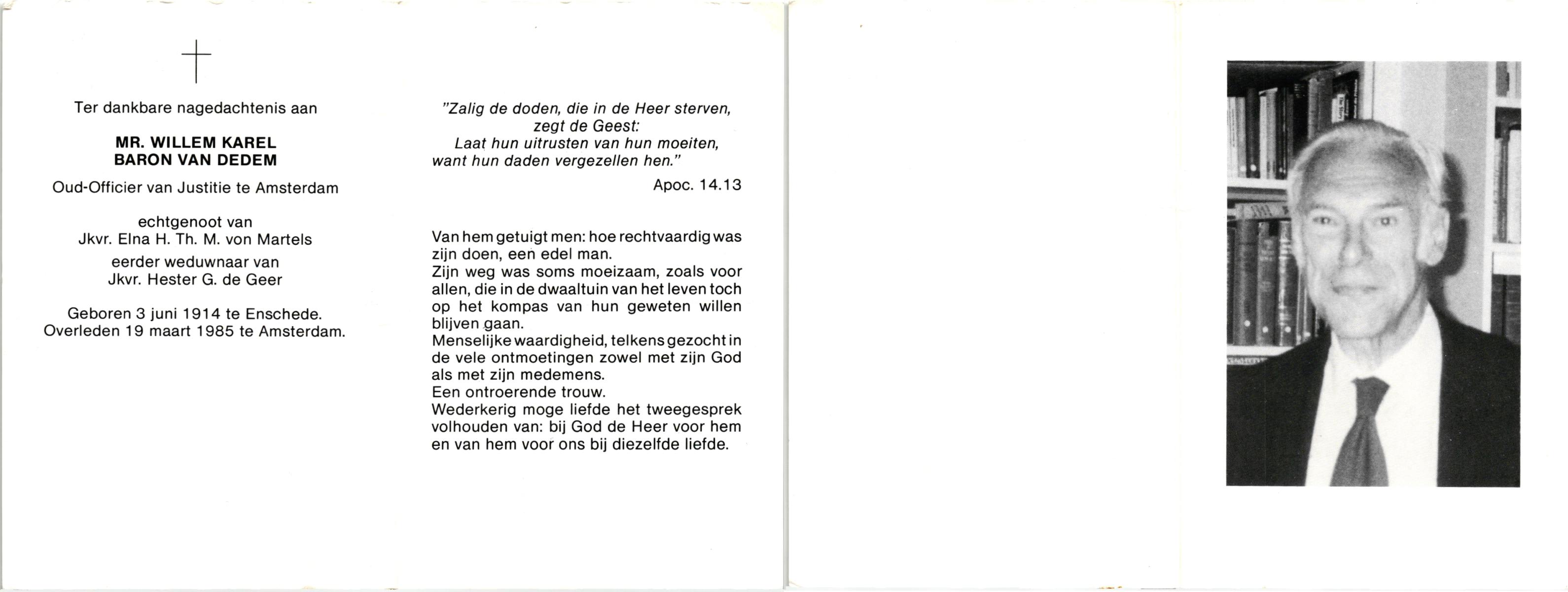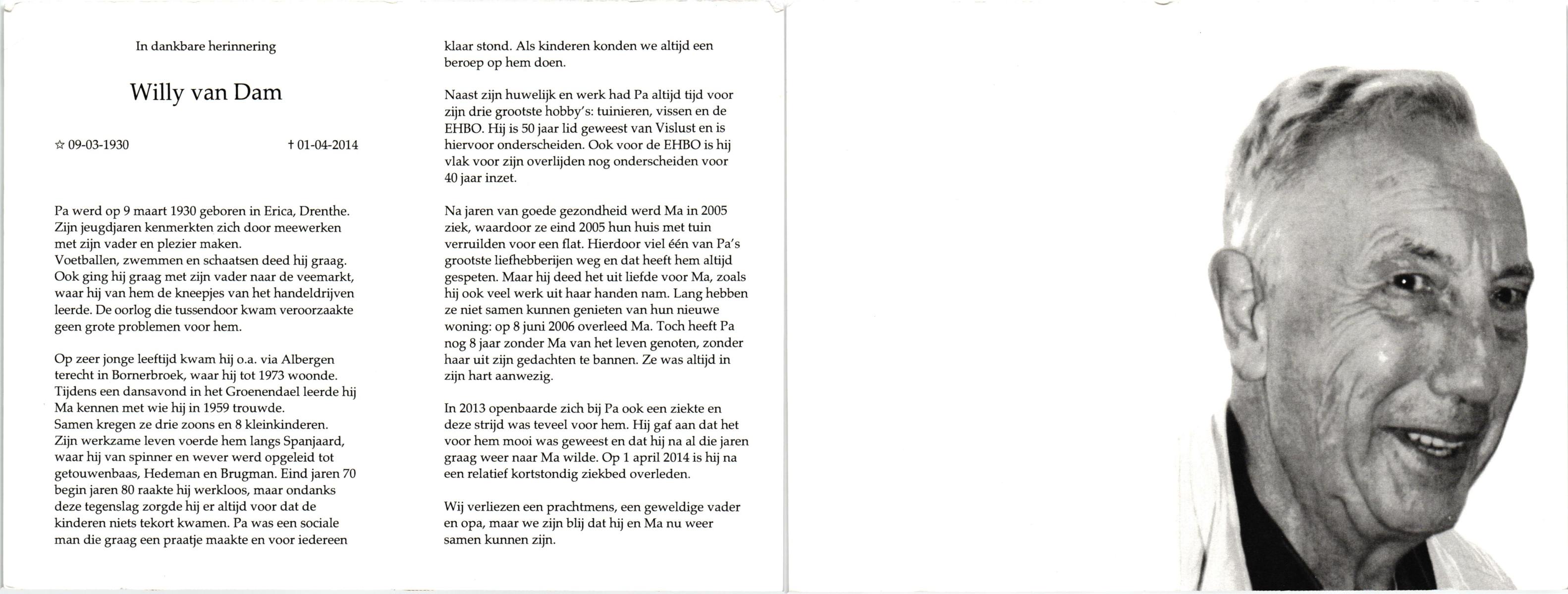 DAM, van, Willy, geboren op 9-3-1930 te Erica, Dr., overleden op 1-4-2014 op 84-jarige leeftijd.