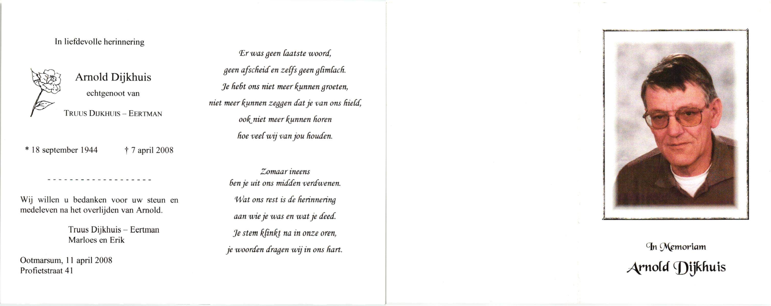 DIJKHUIS, , Arnold, geboren op 18-9-1944, overleden op 7-4-2008 op 63-jarige leeftijd.