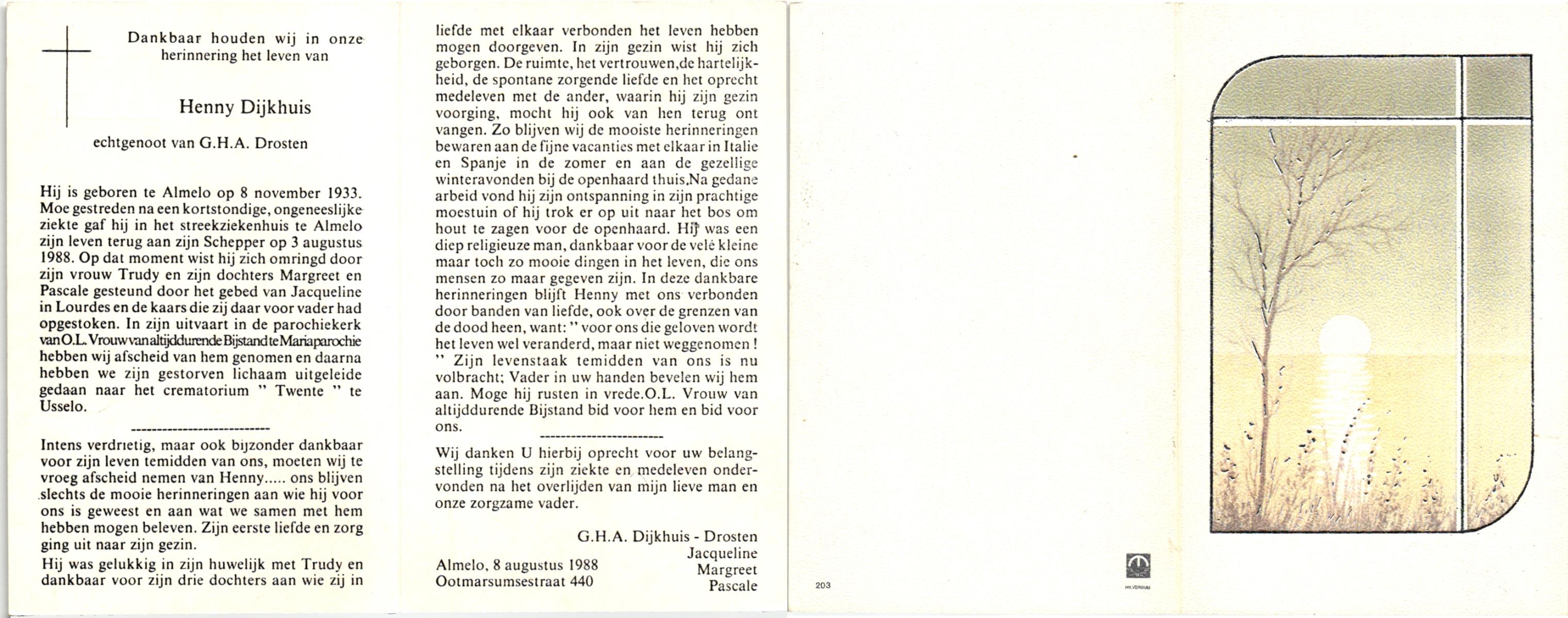 DIJKHUIS, , Henny, geboren op 8-11-1933 te Almelo, overleden op 3-8-1988 te Almelo op 54-jarige leeftijd, gecremeerd te Almelo.