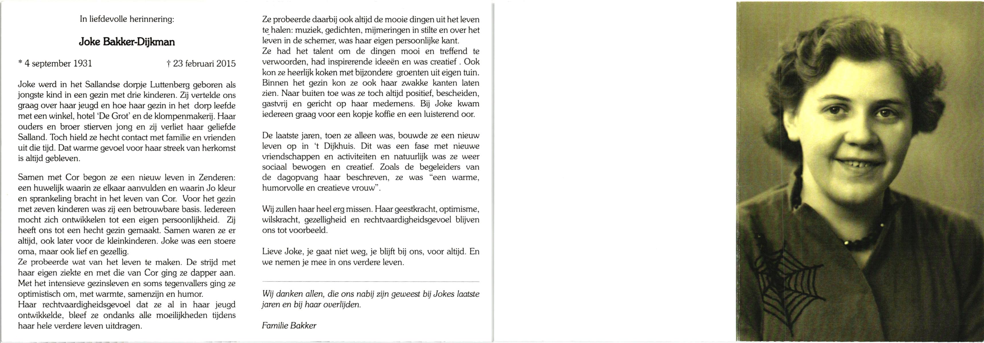 DIJKMAN, , Joke, geboren op 4-9-1931 te Raalte, Luttenberg, overleden op 23-2-2015 op 83-jarige leeftijd.