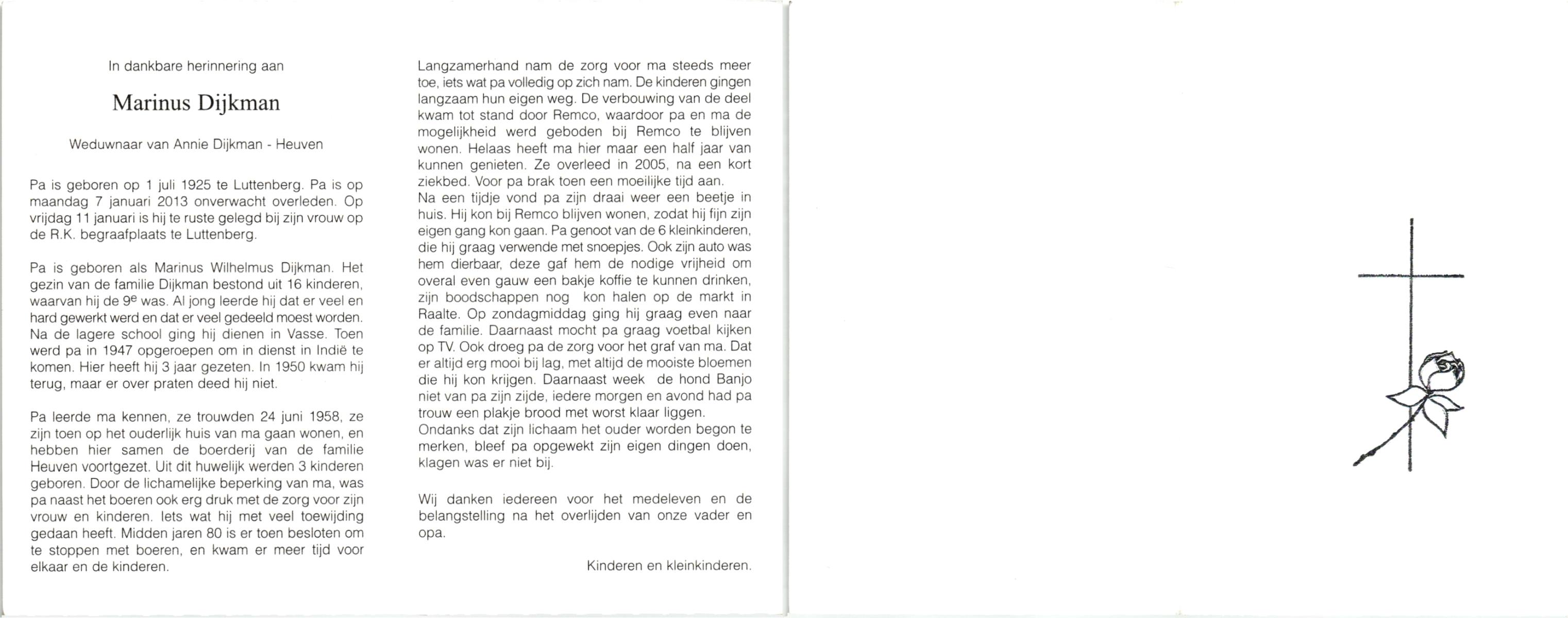 DIJKMAN, , Marinus, geboren op 1-6-1925 te Raalte, overleden op 7-1-2013 op 87-jarige leeftijd, begraven op 11-1-2013 te Raalte, Luttenberg.