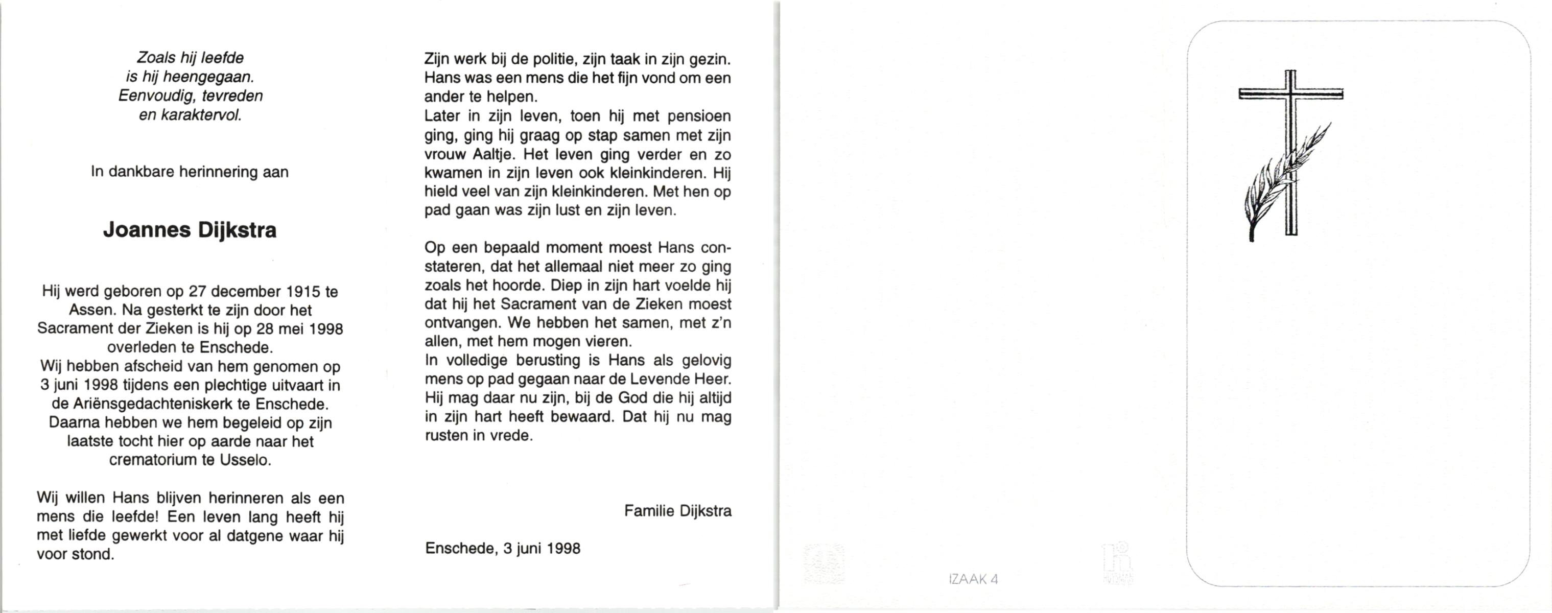 DIJKSTRA, , Joannes, geboren op 27-12-1915 te Assen, overleden op 28-5-1998 te Enschede op 72-jarige leeftijd, gecremeerd op 3-6-1998 te Usselo.