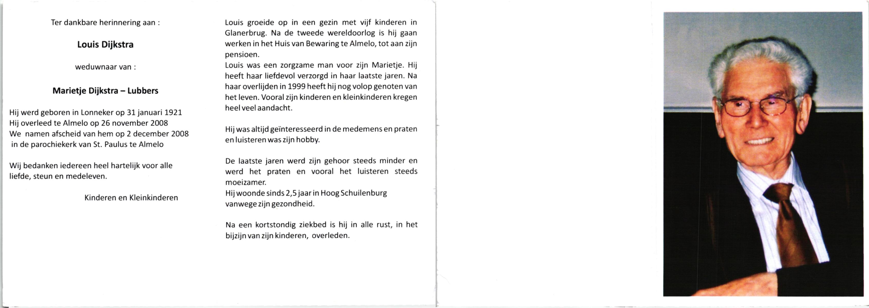 DIJKSTRA, , Louis, geboren op 31-1-1921 te Lonneker, overleden op 26-11-2008 te Almelo op 87-jarige leeftijd.